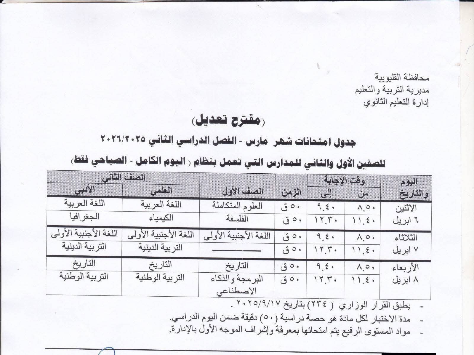 أعلنت مديرية التربية والتعليم بمحافظة القليوبية تعديلات جداول امتحانات شهر مارس بعد تعطيل الدراسة خلال الأسبوع الجاري بسبب الأحوال الجوية، حيث تم ترحيل امتحانات أيام التعطيل إلى الأسبوع المقبل وفق الجداول الجديدة.