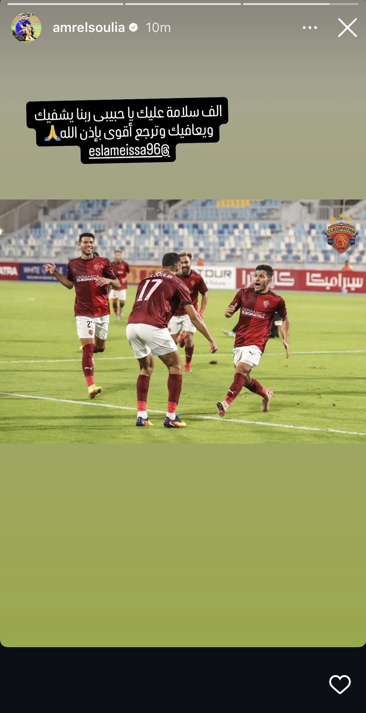 وجه عمرو السولية، لاعب نادي سيراميكا كليوباترا، رسالة لإسلام عيسى بعد تعرضه لإصابة الرباط الصليبي.