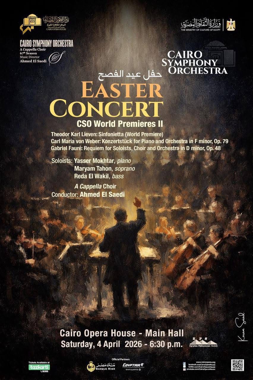 تقيم دار الأوبرا المصرية حفل عيد الربيع لأوركسترا القاهرة السيمفونى والذى يقوده المدير الموسيقى والقائد الأساسى المايسترو أحمد الصعيدى ويشارك خلاله السوبرانو مريم طاحون، الباص رضا الوكيل وعازف البيانو ياسر مختار مع كورال اكابيلا ويأتى ضمن سلسلة عروض الأعمال العالمية وذلك فى السادسة والنصف مساء السبت ٤ أبريل على المسرح الكبير .