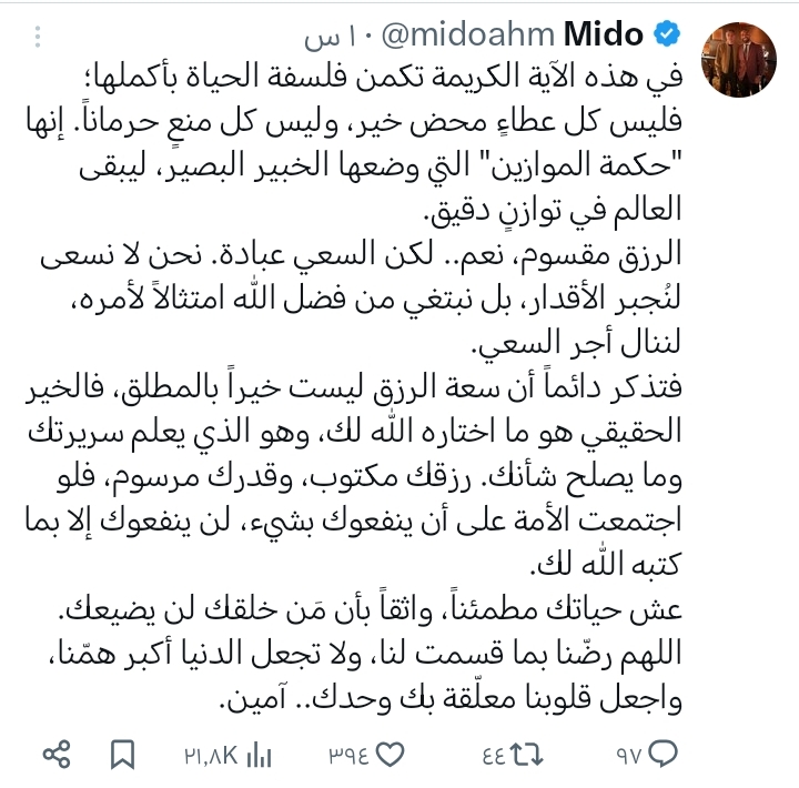 وفي أول تعليق له، كتب ميدو عبر حسابه على منصة "إكس" رسالة قال فيها: «في هذه الآية الكريمة تكمن فلسفة الحياة بأكملها؛ فليس كل عطاءٍ محض خير، وليس كل منعٍ حرمانًا. إنها "حكمة الموازين" التي وضعها الخبير البصير، ليبقى العالم في توازنٍ دقيق.