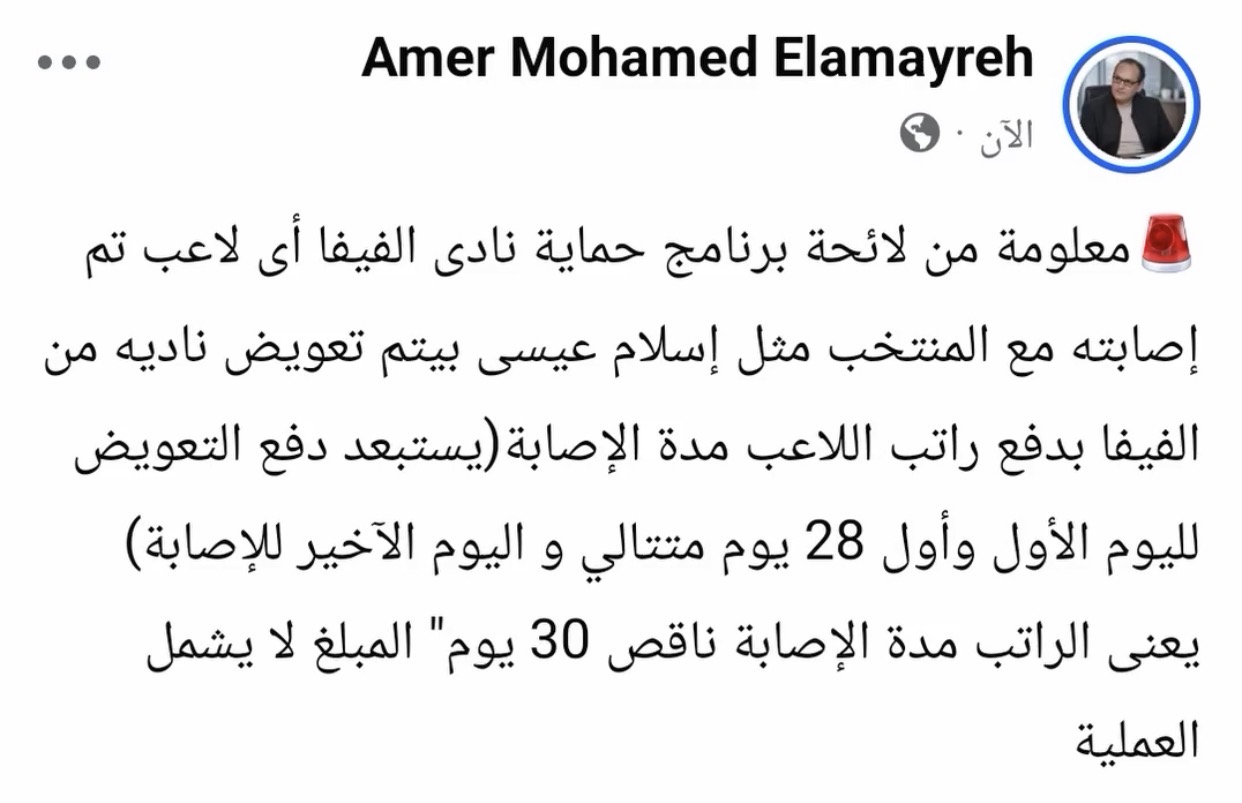 وكتب عامر العمايرة عبر حسابه الشخصي بموقع فيسبوك: "معلومة من لائحة برنامج حماية نادى الفيفا أى لاعب تم إصابته مع المنتخب مثل إسلام عيسى بيتم تعويض ناديه من الفيفا بدفع راتب اللاعب مدة الإصابة(يستبعد دفع التعويض لليوم الأول وأول 28 يوم متتالي و اليوم الآخير للإصابة) يعنى الراتب مدة الإصابة ناقص 30 يوم" المبلغ لا يشمل العملية".