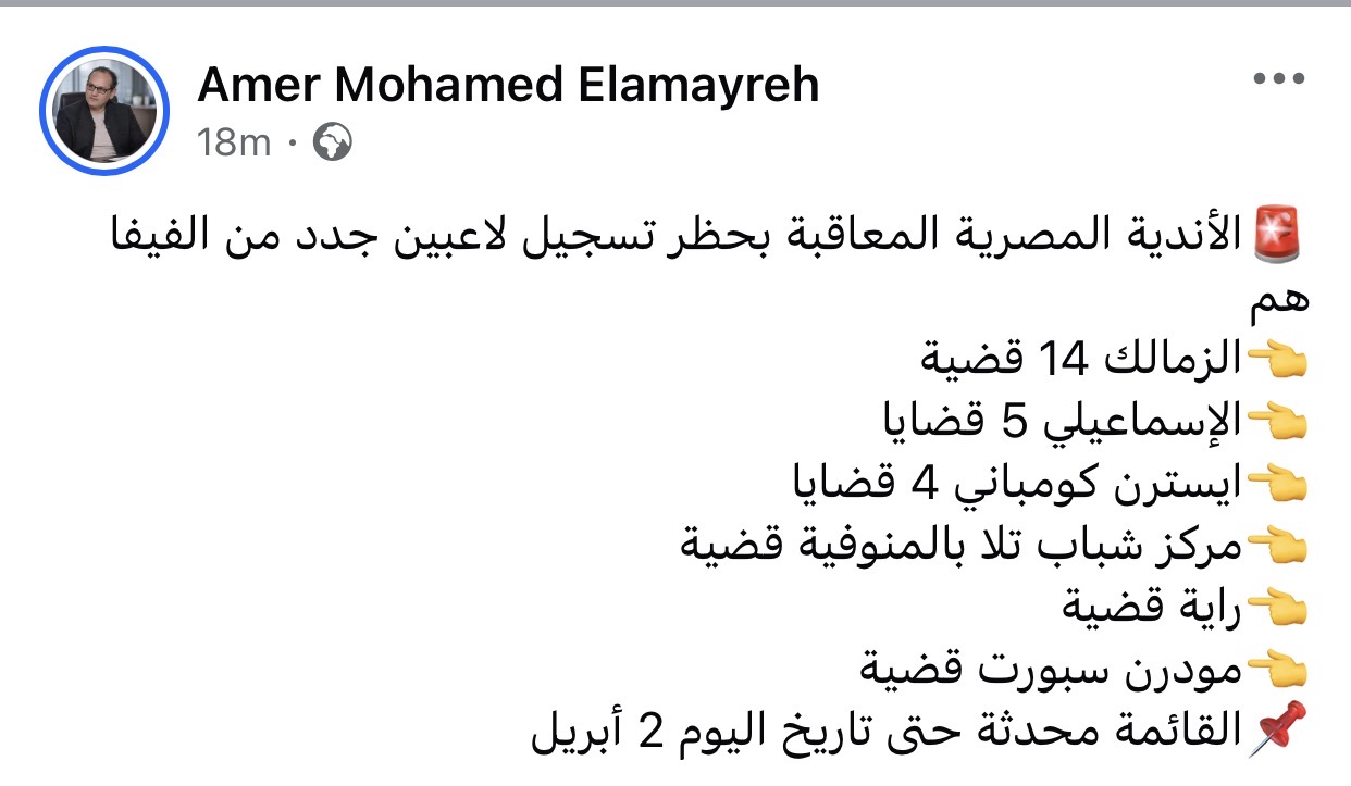 كشف عامر العمايرة خبير اللوائح الرياضية عن قائمة الأندية المصرية الصادر بحقها قرارات من الاتحاد الدولي لكرة القدم “فيفا” بإيقاف قيد لاعبين جدد، وذلك وفقًا لآخر تحديث حتى اليوم 2 أبريل