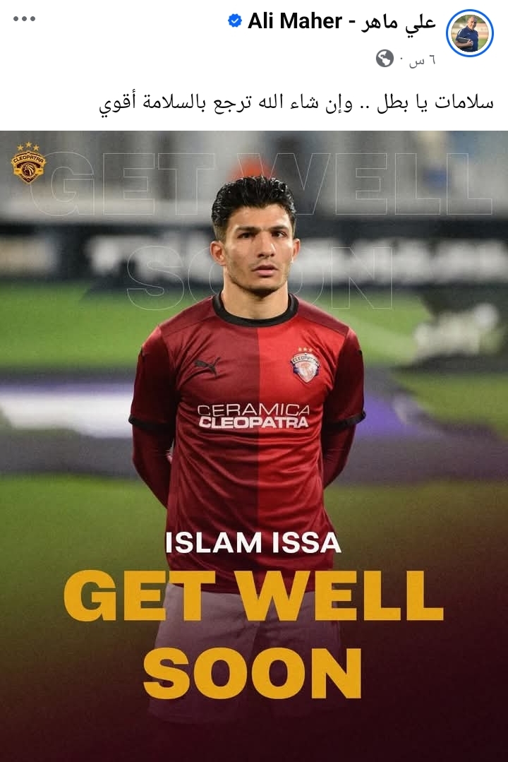 حرص على ماهر المدير الفنى لفريق سيراميكا كليو باترا، على دعم لاعبه إسلام عيسى بعد إصابته بقطع في الرباط الصليبى خلال مشاركته مع المنتخب أمام إسبانيا في المباراة الودية التي انتهت بالتعادل السلبى.