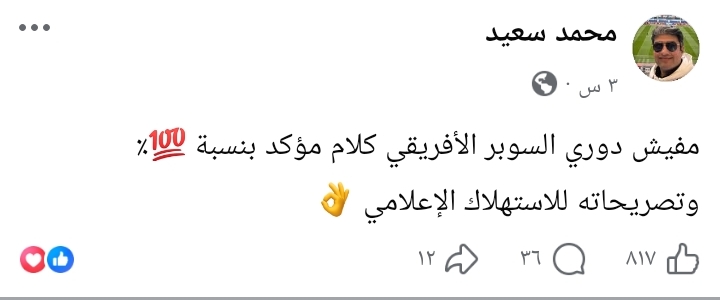 وكتب محمد سعيد عبر حسابه على فيسبوك: "مفيش دوري السوبر الإفريقي، الكلام غير مؤكد بنسبة 💯٪، وتصريحاته للاستهلاك الإعلامي".