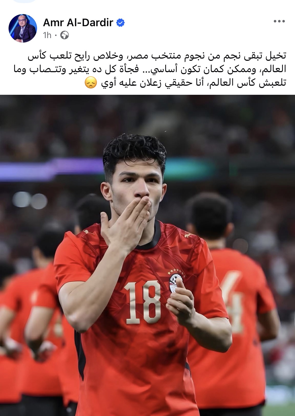 وكتب الدرديري عبر حسابه الشخصي بموقع فيسبوك: “تخيل تبقى نجم من نجوم منتخب مصر، وخلاص رايح تلعب كأس العالم، وممكن كمان تكون أساسي… فجأة كل ده يتغير وتتصاب وما تلعبش كأس العالم، أنا حقيقي زعلان عليه أوي”