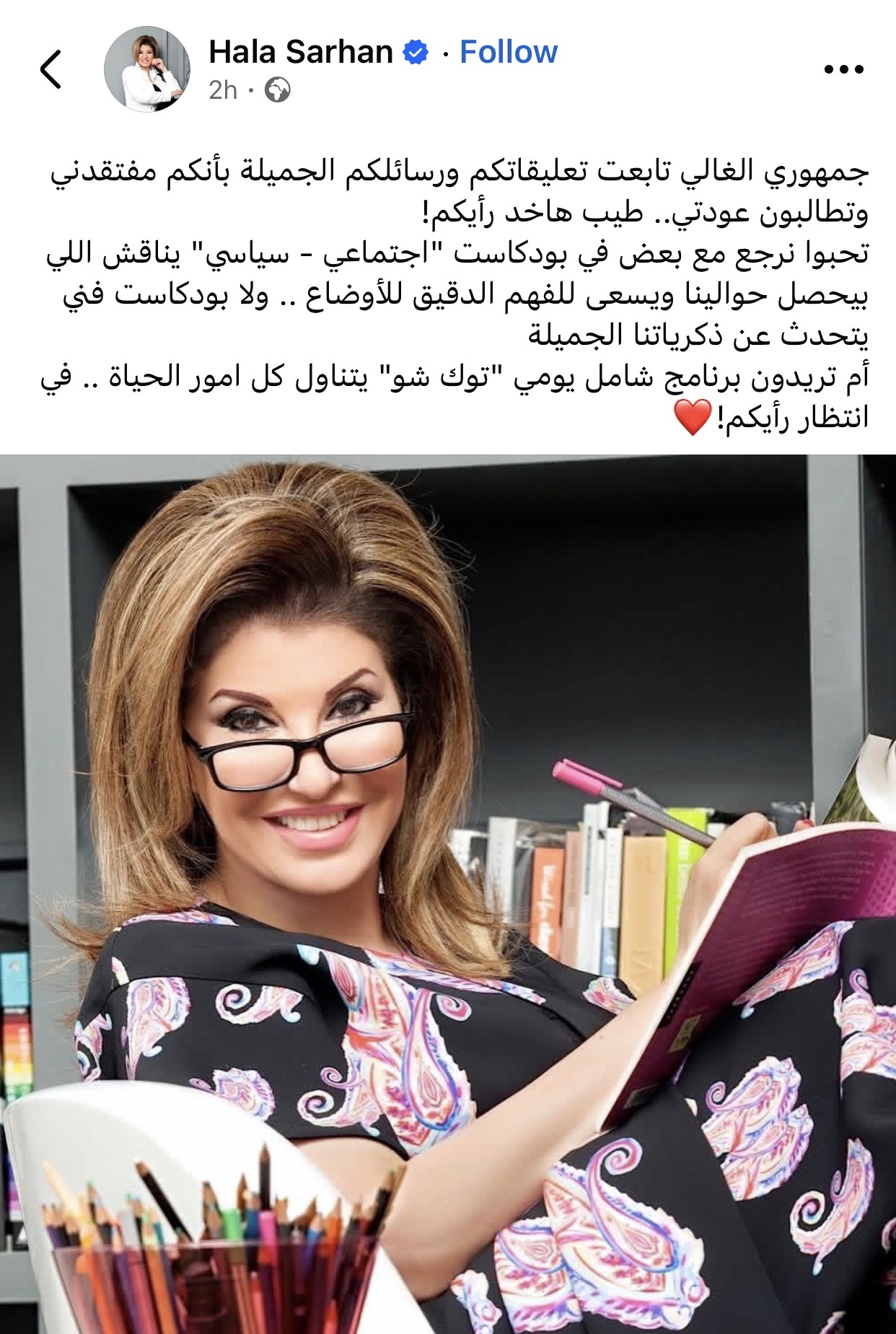 ونشرت هالة عبر حسابها على «فيسبوك»: “تابعت تعليقاتكم ورسائلكم الجميلة، وسعيده إنكم مفتقدين وجودي، لذلك أحب أن أعرف رأيكم”