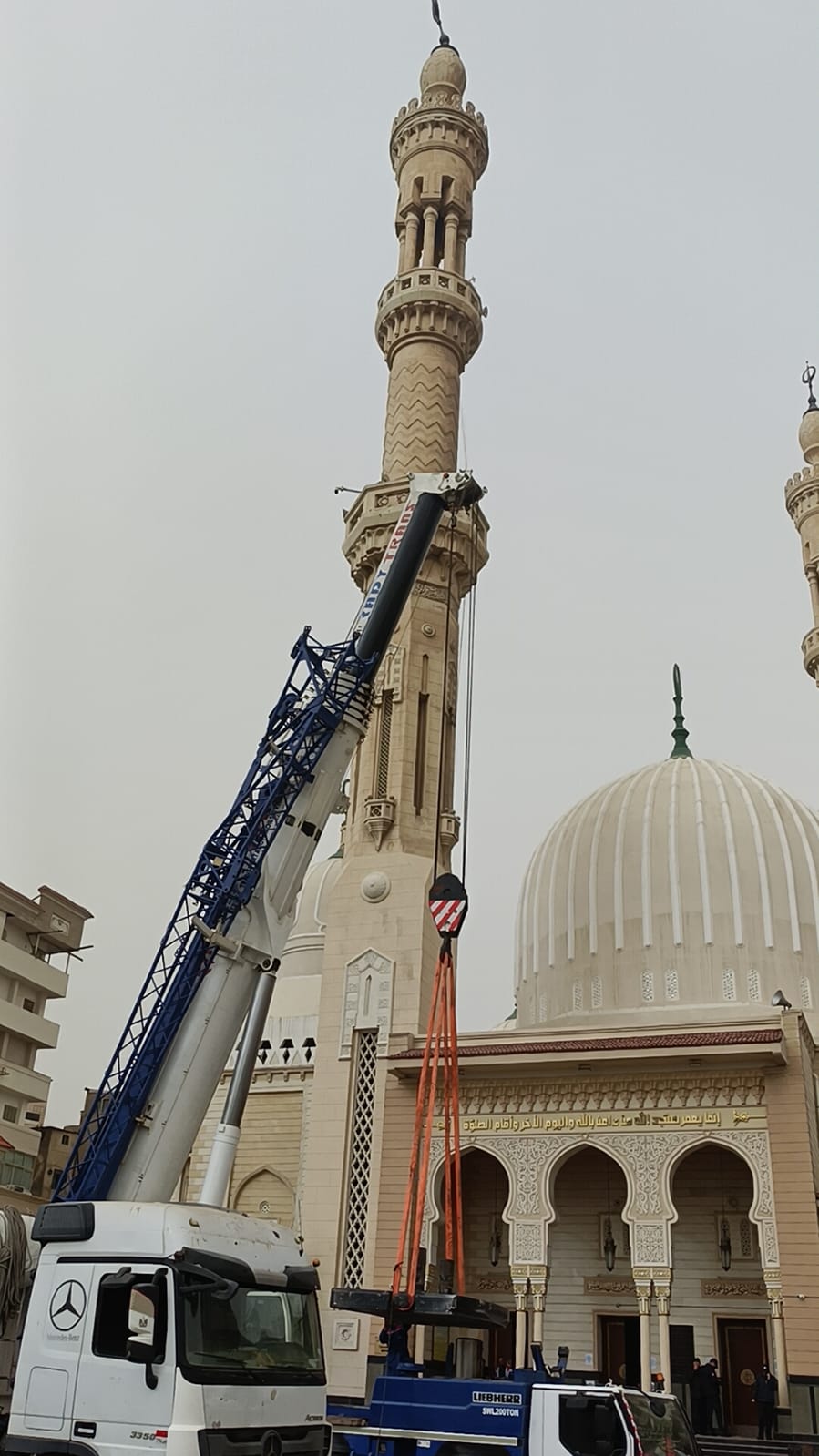 وفي إطار تنفيذ التوجيهات، نسقت الإدارة الهندسية بالوزارة مع شركة "المقاولون العرب" بالدفع بمعدات ثقيلة مناسبة إلى موقع المسجد للتعامل مع الهلال المائل أعلى المئذنة وفق الإجراءات الفنية اللازمة.