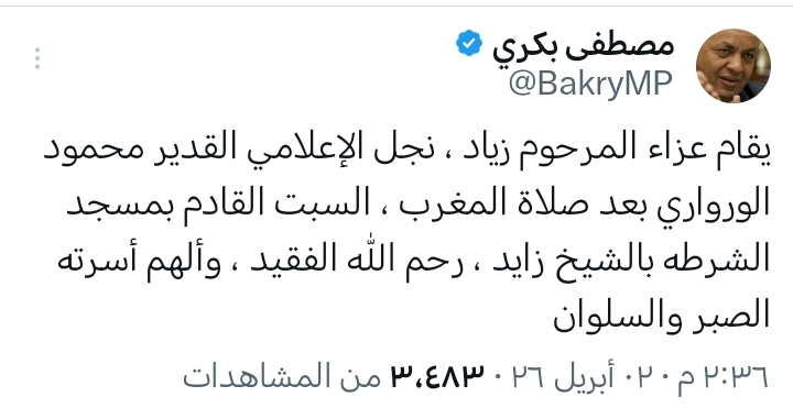 وكتب بكري عبر حسابه على "إكس":"يقام عزاء المرحوم زياد، نجل الإعلامي القدير محمود الورواري، بعد صلاة المغرب يوم السبت القادم بمسجد الشرطة بالشيخ زايد. رحم الله الفقيد، وألهم أسرته الصبر والسلوان"