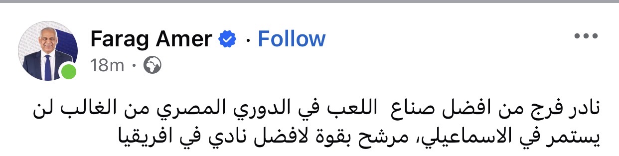 وكتب فرج عامر عبر حسابه الشخصي بموقع فيسبوك: “نادر فرج من افضل صناع اللعب في الدوري المصري من الغالب لن بستمر في الاسماعيلي، مرشح بقوة لافضل نادي في افريقيا”.
