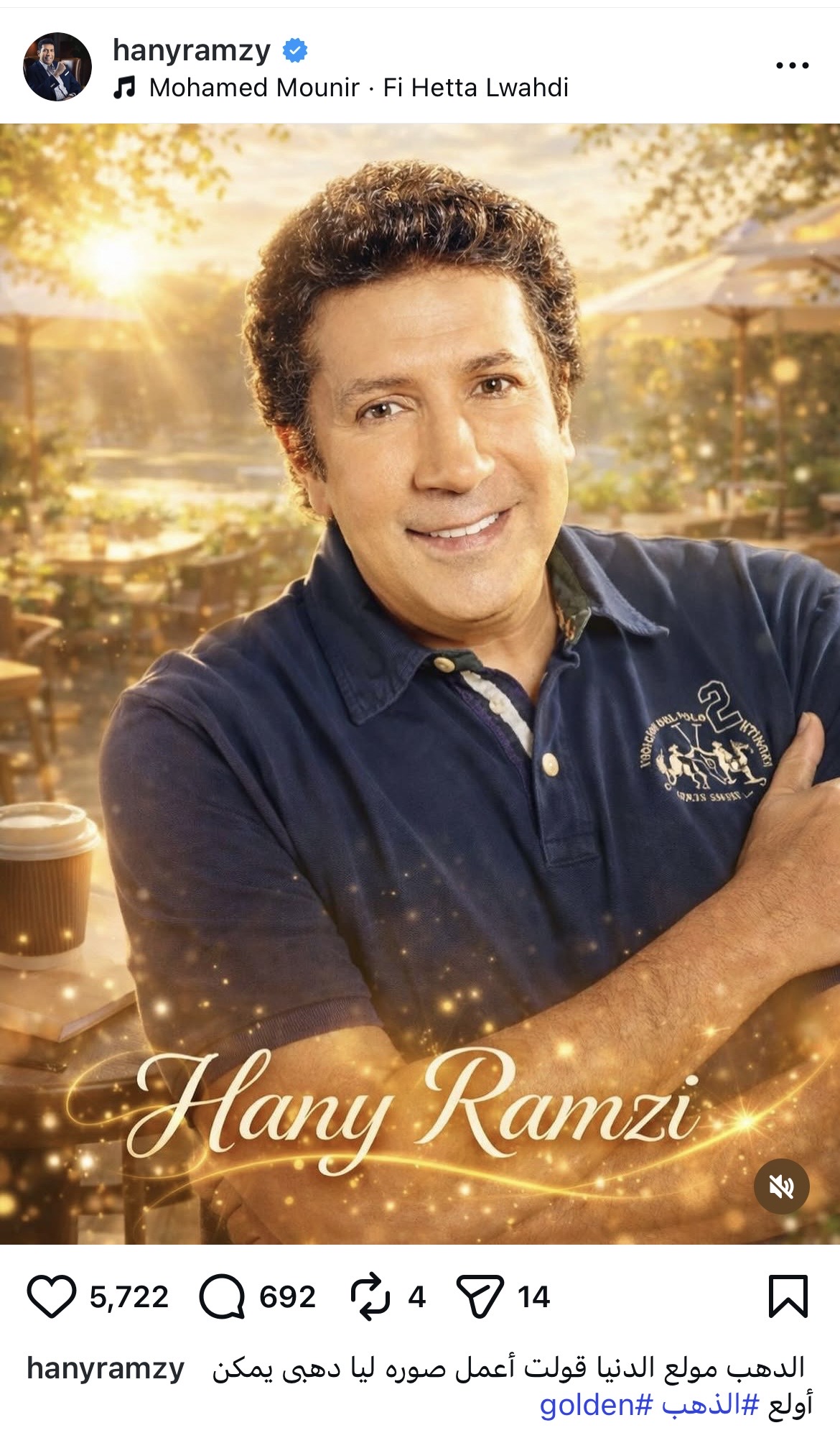 ونشر هاني رمزي صورة له، وعلق عليها: “الدهب مولع الدنيا، قولت أعمل صورة ليا دهبي، يمكن أولع”.