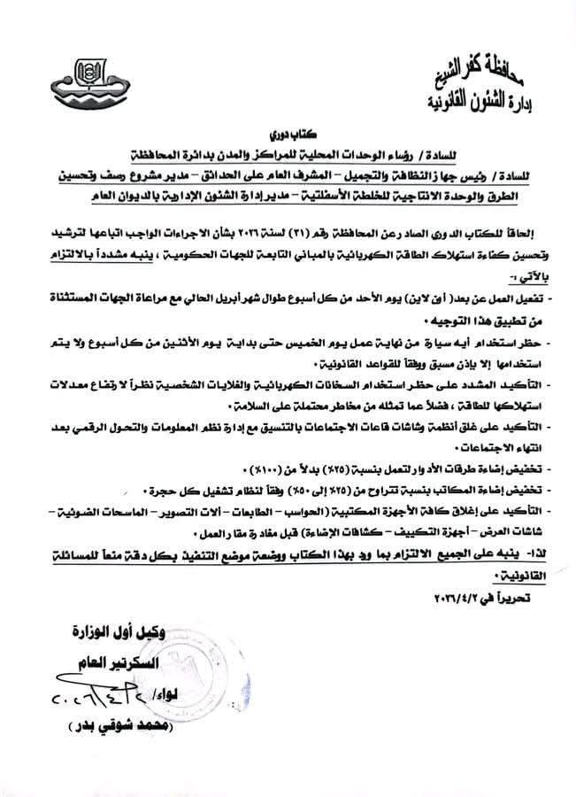 أصدر اللواء محمد شوقي بدر، سكرتير عام محافظة كفر الشيخ كتابًا دوريًا، موجهًا لرؤساء الوحدات المحلية ومديري المديريات الخدمية، يتضمن حزمة من القرارات الصارمة لترشيد وتحسين كفاءة استهلاك الطاقة الكهربائية بالمباني التابعة للجهات الحكومية بالمحافظة.