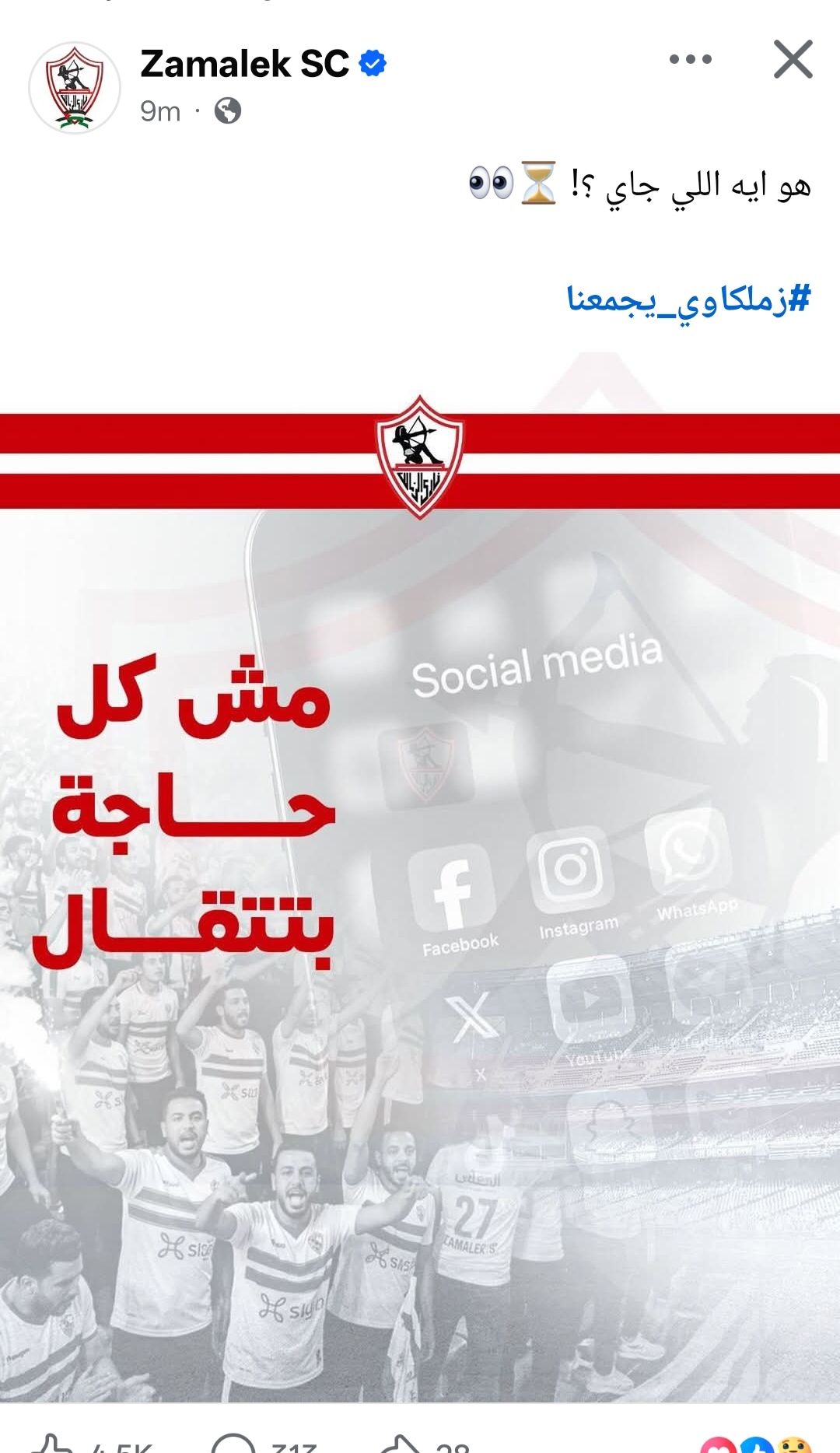 ونشر الحساب الرسمي لنادي الزمالك على موقع التواصل الاجتماعي «فيسبوك» منشورا، في إشارة إلى مفاجأة سارة للجماهير و جاء كالآتي: هو ايه الي جاي ،مش كل حاجه بتتقال.