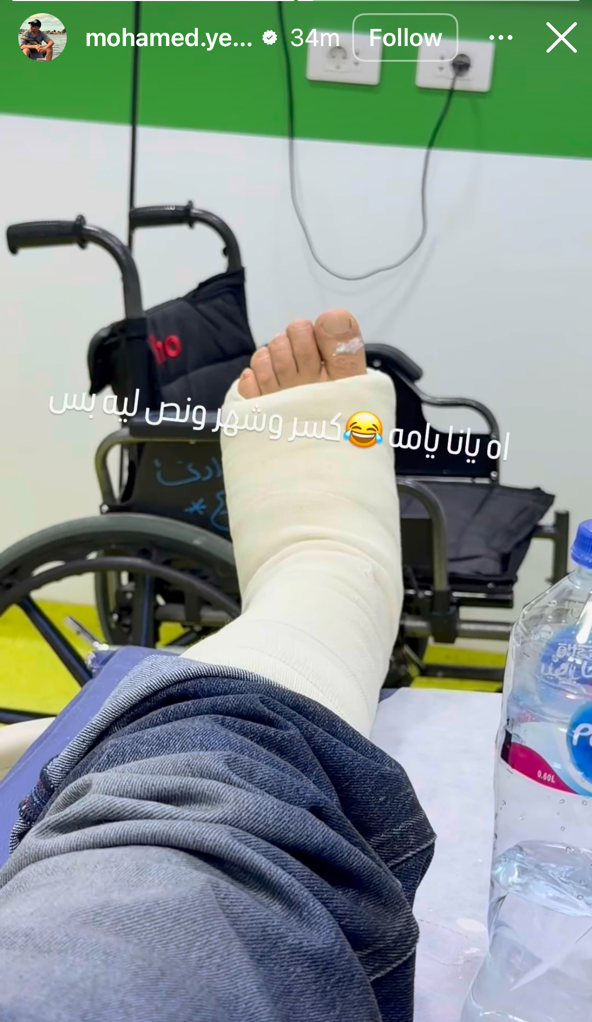 أعلن الملحن محمد يحيي عن تعرضه إلى كسر في القدم، وذلك من خلال صورة نشرها عبر خاصية الاستوري، علي تطبيق إنستجرام.