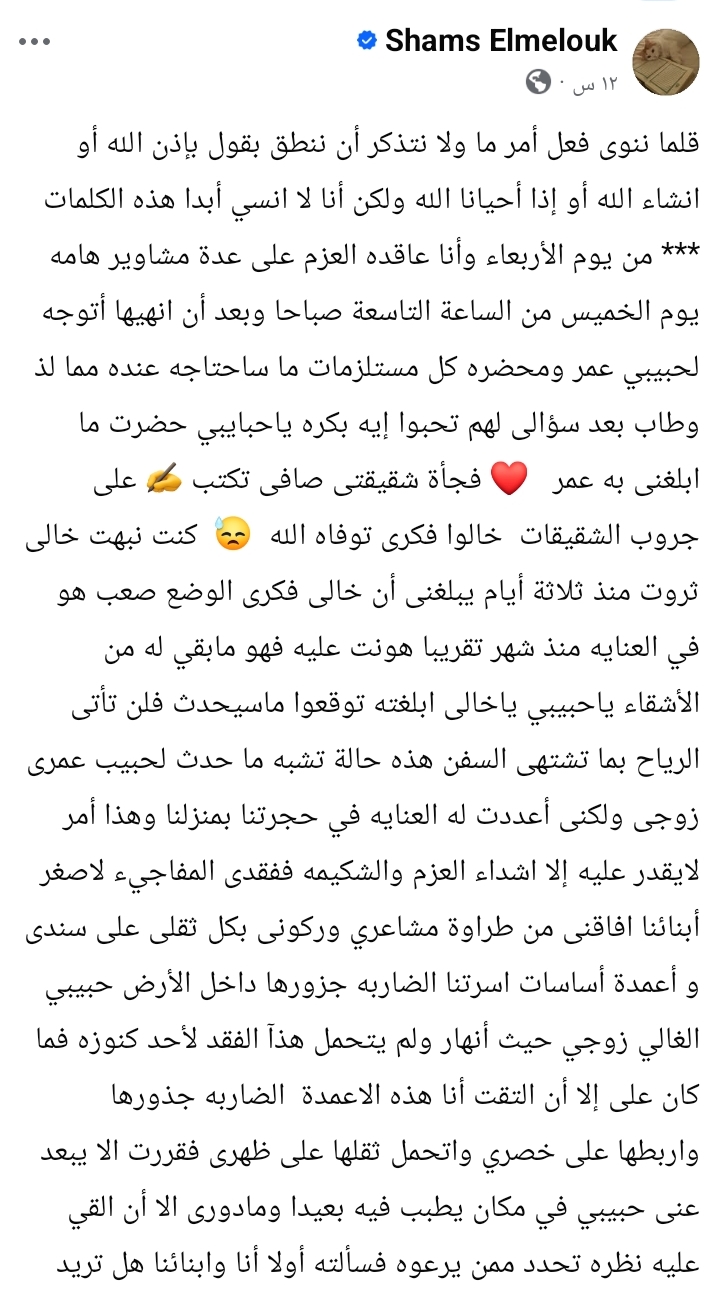 وكتبت شمس البارودي عبر حسابها على فيسبوك: "أعددت له كل سبل العناية في حجرتنا بمنزلنا، وهذا أمر لا يقدر عليه إلا أشداء العزم والشكيمة. فقدي المفاجئ لأصغر أبنائنا جعلني أستجمع كل قوتي وأركان أسرتنا الضاربة جذورها عميقًا في الأرض، لأظل بجانب حبيبي الغالي. لم أتحمل فكرة أن يكون بعيدًا عنّي في مكان طبي بعيد، فقررت أن أكون أنا من يعتني به."