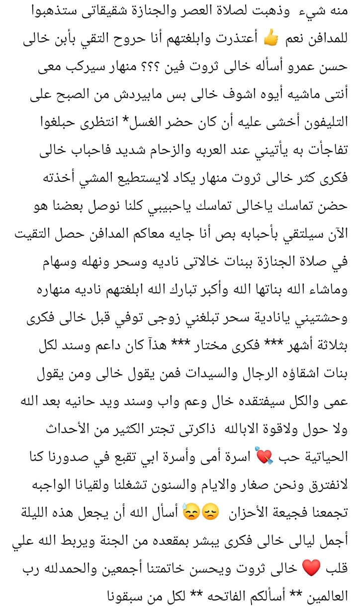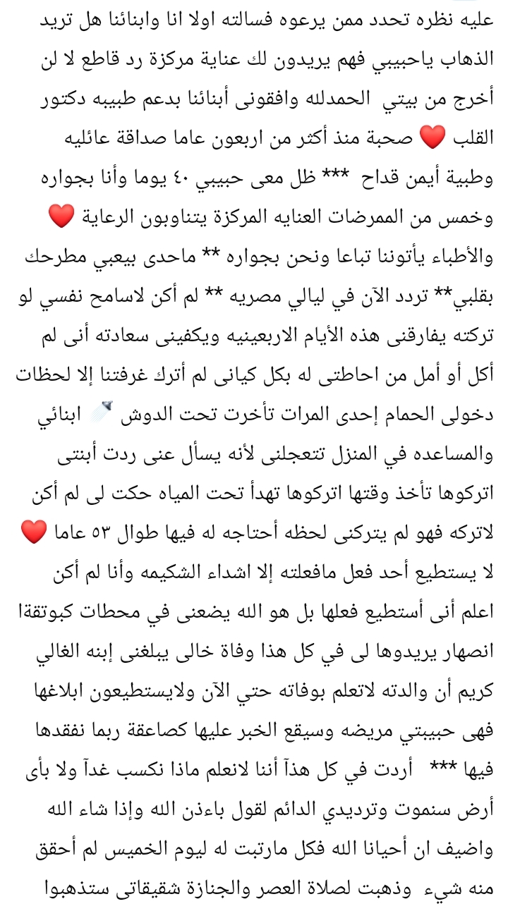 وأضافت: "سألته أنا وأبناؤنا إذا كان يريد الذهاب إلى المستشفى، فرد قاطعًا: 'لا، لن أخرج من بيتي وبحمد الله وافق أبناؤنا، بدعم طبيب القلب أيمن قداح، الذي ظل معنا لمدة 40 يومًا كما توافدت خمس ممرضات للتناوب على رعايته، بينما كان الأطباء يأتون تباعًا. لم يشعر قلبي بالراحة إلا وأنا بجواره، محاطة بكل من يحب ويرعاه."