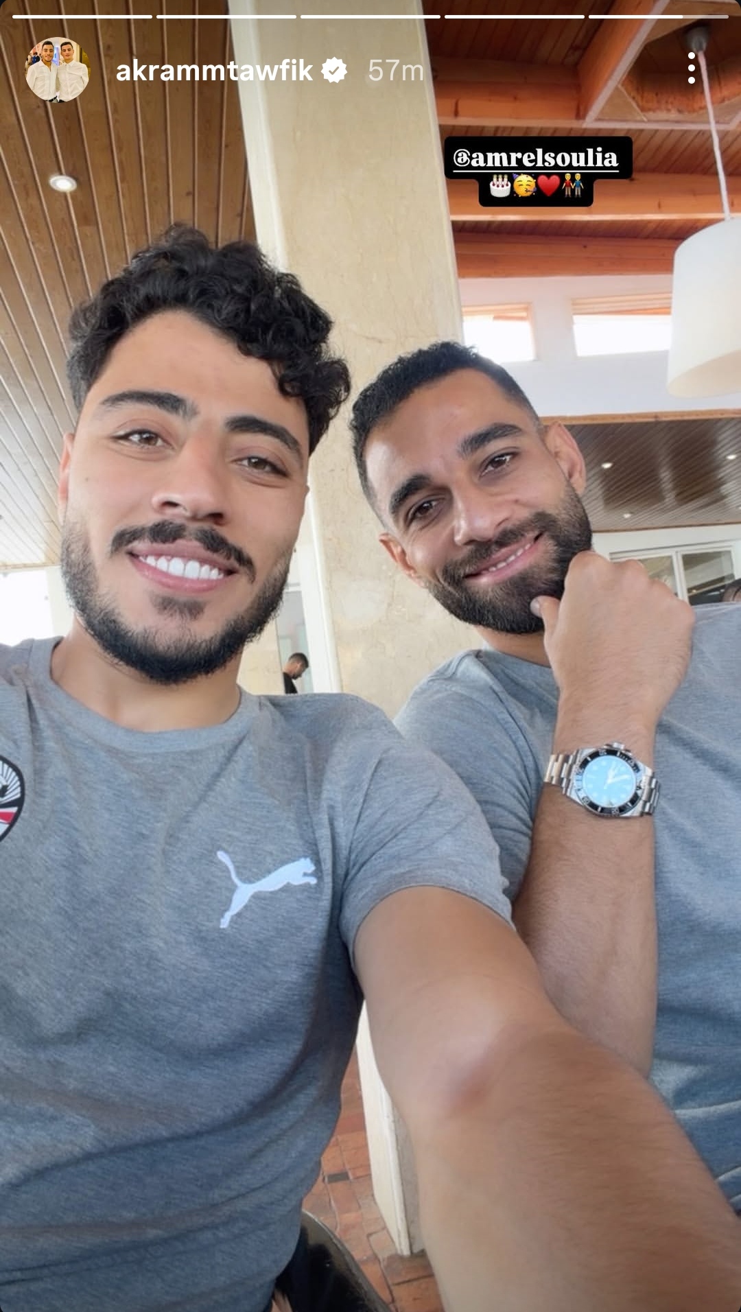 حرص أكرم توفيق لاعب نادي الشمال القطري، علي تهنئة عمرو السولية لاعب سيراميكا كليوباترا الحالي والأهلي سابقا، بمناسبة عيد ميلاده.