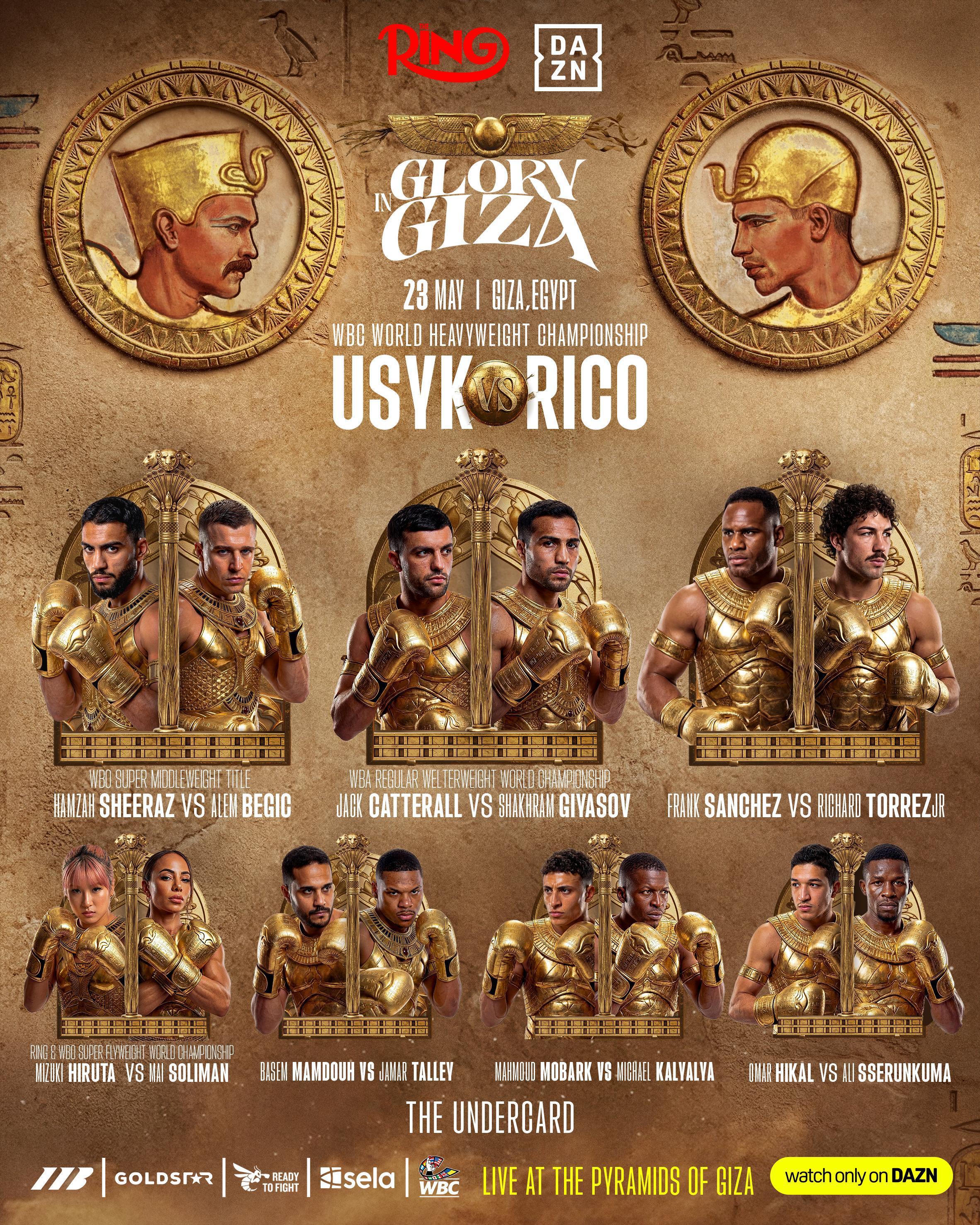 أعلن المستشار تركي آل الشيخ، رئيس الاتحاد السعودي للملاكمة، عن تفاصيل البطاقة التمهيدية لعرض Glory in Giza، المقرر إقامته يوم السبت 23 مايو في مصر، والتي تضم مجموعة من النزالات العالمية البارزة على ألقاب كبرى، وذلك بالتعاون مع مجلة The Ringوبدعم من Matchroom Boxing.