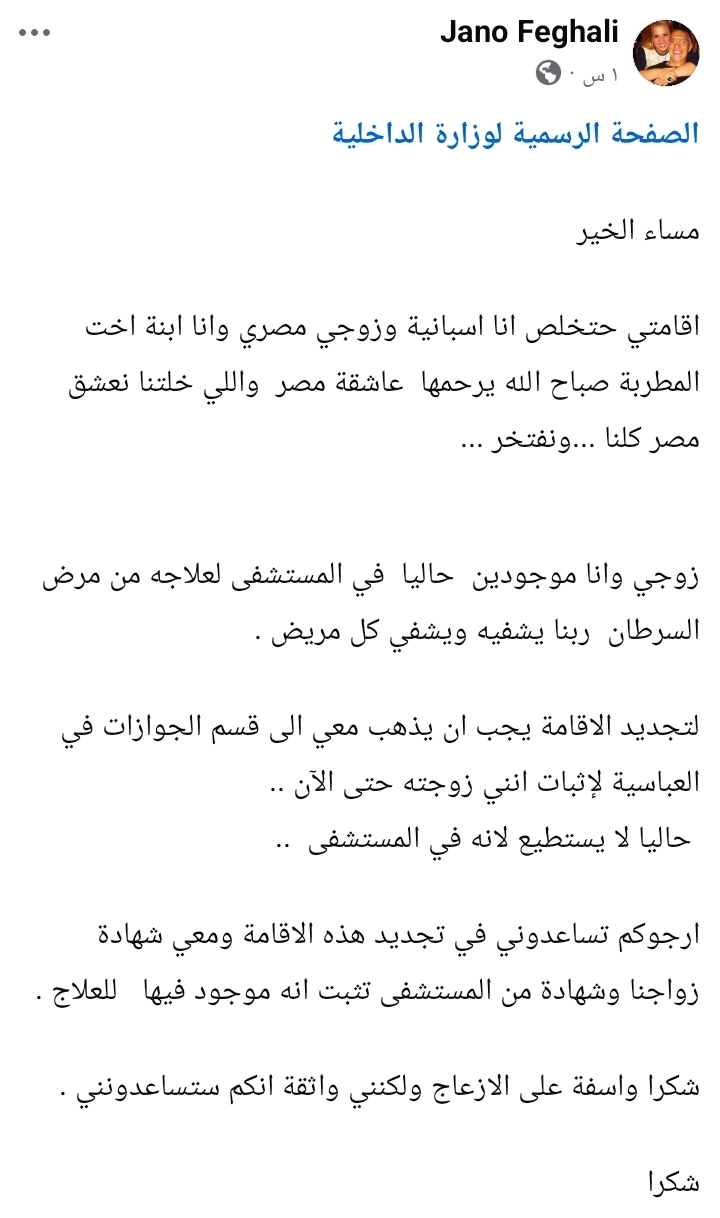 وجهت جانو فغالي، ابنة شقيقة الفنانة الراحلة صباح، رسالة عبر حسابها على موقع "فيسبوك"، طالبت خلالها وزارة الداخلية المصرية بالتدخل لمساعدتها في تجديد إقامتها داخل مصر، في ظل ظروف إنسانية صعبة.