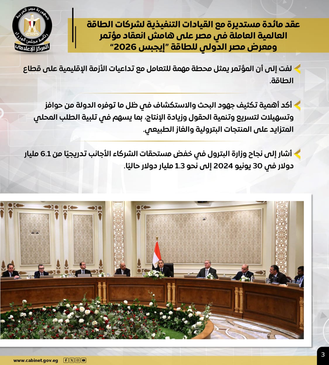 وشملت الأنشطة، عقد رئيس الوزراء مائدة مستديرة مع القيادات التنفيذية لشركات الطاقة العالمية العاملة في مصر على هامش انعقاد مؤتمر ومعرض مصر الدولي للطاقة "إيجبس 2026"، لافتًا إلى أن المؤتمر يمثل محطة مهمة للتعامل مع تداعيات الأزمة الإقليمية على قطاع الطاقة، ومؤكدًا على أهمية تكثيف جهود البحث والاستكشاف في ظل ما توفره الدولة من حوافز وتسهيلات لتسريع وتنمية الحقول وزيادة الإنتاج، بما يسهم في تلبية الطلب المحلي المتزايد على المنتجات البترولية والغاز الطبيعي.