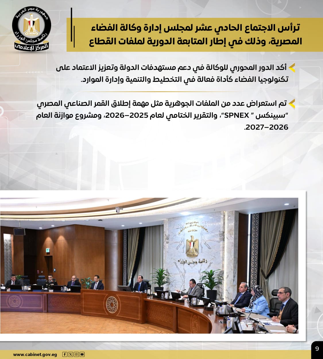 كما ترأس رئيس الوزراء الاجتماع الحادي عشر لمجلس إدارة وكالة الفضاء المصرية، وذلك في إطار المتابعة الدورية لملفات القطاع، مؤكدًا الدور المحوري للوكالة في دعم مستهدفات الدولة وتعزيز الاعتماد على تكنولوجيا الفضاء كأداة فعالة في التخطيط والتنمية وإدارة الموارد، وقد تم استعراض عدد من الملفات الجوهرية مثل مهمة إطلاق القمر الصناعي المصري "سبينكس " SPNEX"، والتقرير الختامي لعام 2025–2026، ومشروع موازنة العام 2026–2027.