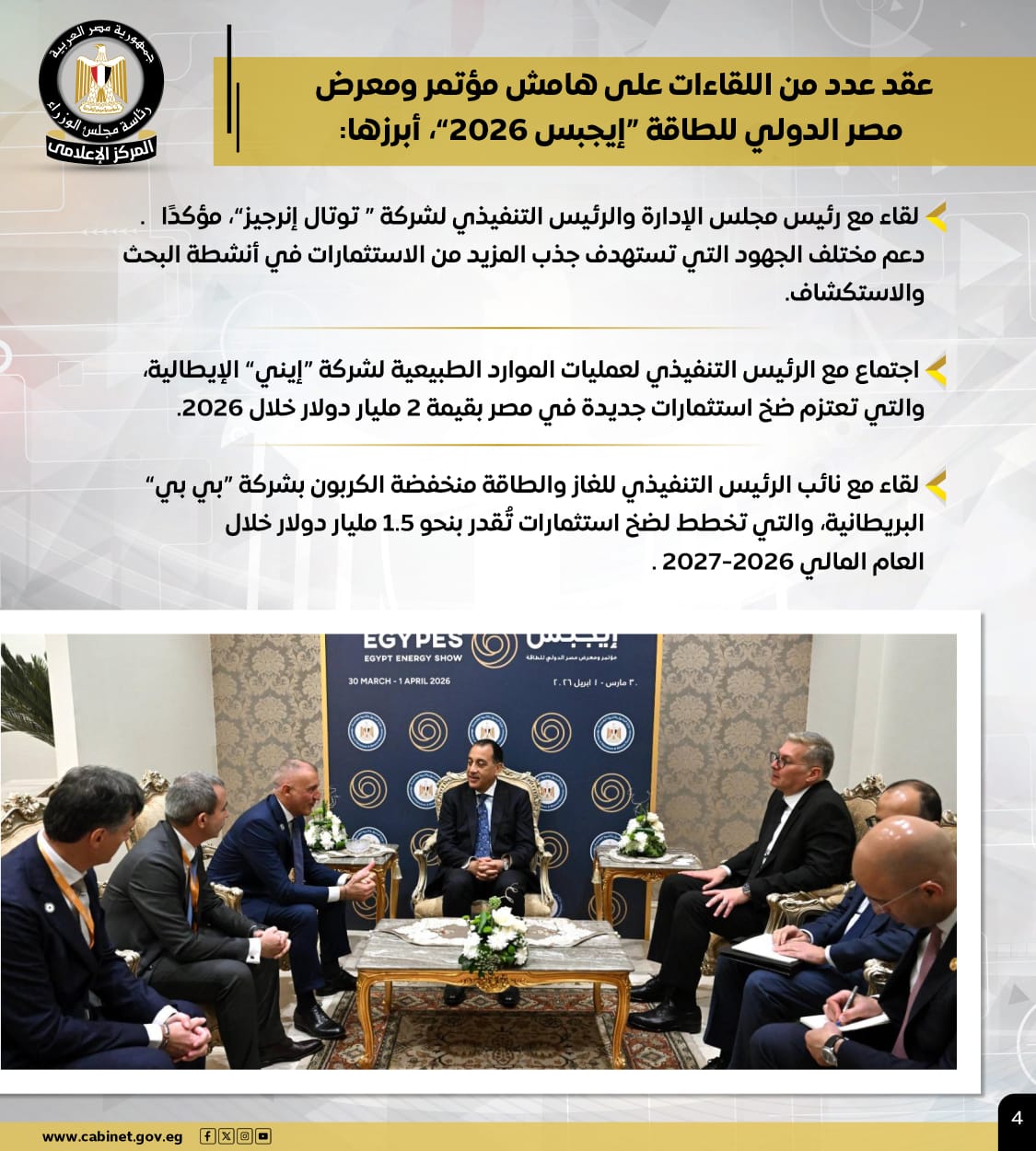 كما عقد رئيس الوزراء عددًا من اللقاءات على هامش مؤتمر ومعرض مصر الدولي للطاقة "إيجبس 2026"، أبرزها: لقاًء مع رئيس مجلس الإدارة والرئيس التنفيذي لشركة " توتال إنرجيز"، مؤكدًا دعم مختلف الجهود التي تستهدف جذب المزيد من الاستثمارات في أنشطة البحث والاستكشاف، واجتماع مع الرئيس التنفيذي لعمليات الموارد الطبيعية لشركة "إيني" الإيطالية، والتي تعتزم ضخ استثمارات جديدة في مصر بقيمة 2 مليار دولار خلال 2026، كما عقد لقاًء مع نائب الرئيس التنفيذي للغاز والطاقة منخفضة الكربون بشركة "بي بي" البريطانية، والتي تخطط لضخ استثمارات تُقدر بنحو 1.5 مليار دولار خلال العام المالي 2026-2027.