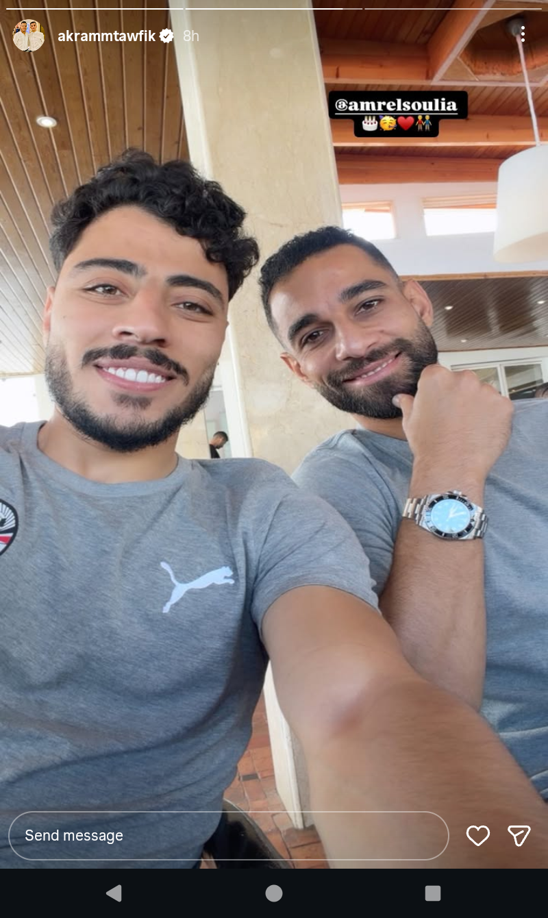 هنأ اللاعب أكرم توفيق اللاعب عمرو السولية بمناسبة عيد ميلاده عبر صفحته على موقع التواصل الاجتماعي إنستجرام خلال خاصية الاستوري.