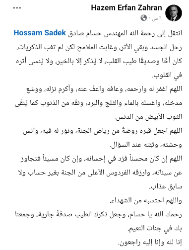 نعى حازم زهران صديق المهندس حسام صادق، الذي استشهد أثناء تواجده في موقع عمله بدولة الإمارات، إثر سقوط شظايا على حقل غاز في الإمارات العربية المتحدة.