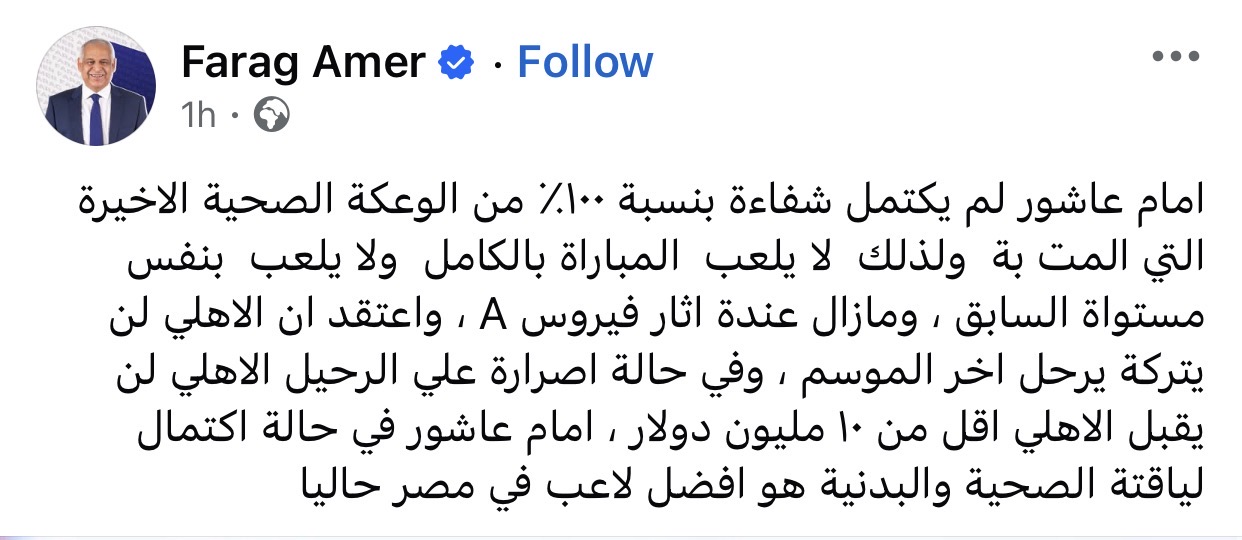 وكتب فرج عامر عبر حسابه الشخصي بموقع فيسبوك: “امام عاشور لم يكتمل شفاءة بنسبة ١٠٠٪ من الوعكة الصحية الاخيرة التي ألمت به ولذلك لا يلعب المباراة بالكامل ولا يلعب بنفس مستواة السابق ، ومازال عندة اثار فيروس A”.
