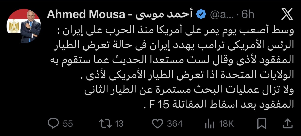 وكتب أحمد موسى عبر حسابه الشخصي على منصة إكس: "وسط أصعب يوم يمر على أمريكا منذ الحرب على إيران :