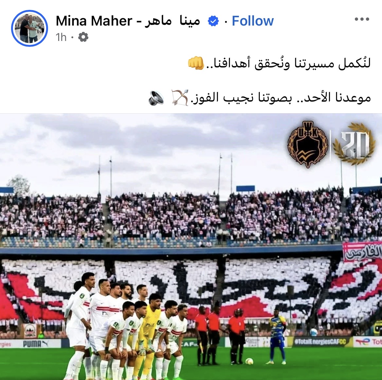وكتب مينا ماهر عبر حسابه الشخصي بموقع فيسبوك: "لنكمل مسيرتنا ونحقق أهدافنا..موعدنا الأحد بصوتنا نجيب الفوز".