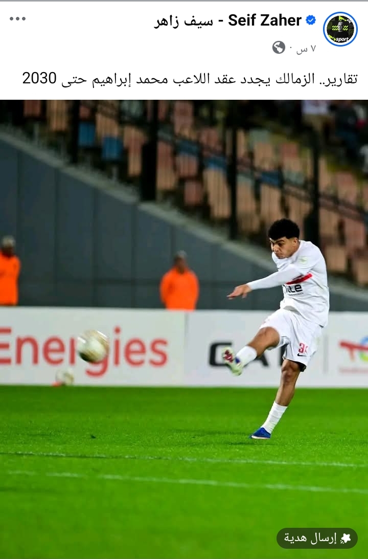 وكتب الإعلامي سيف زاهر عبر حسابه علي فيسبوك: "الزمالك يجدد عقد اللاعب محمد إبراهيم حتى 2030".