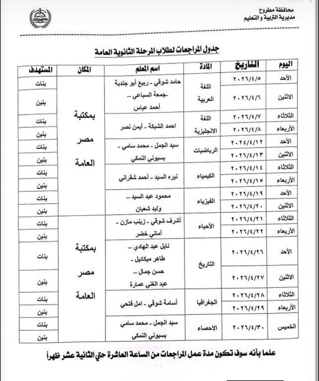 أعلنت نادية فتحي وكيل وزارة التربية والتعليم بمطروح، إنطلاق مبادرة المراجعة النهائية للشهادة الثانوية بقاعات مكتبة مصر العامة ، وسط مدينة مرسى مطروح صباح الأحد المقبل، وذلك تنفيذا لتعليمات للواء محمد الزملوط محافظ مطروح.