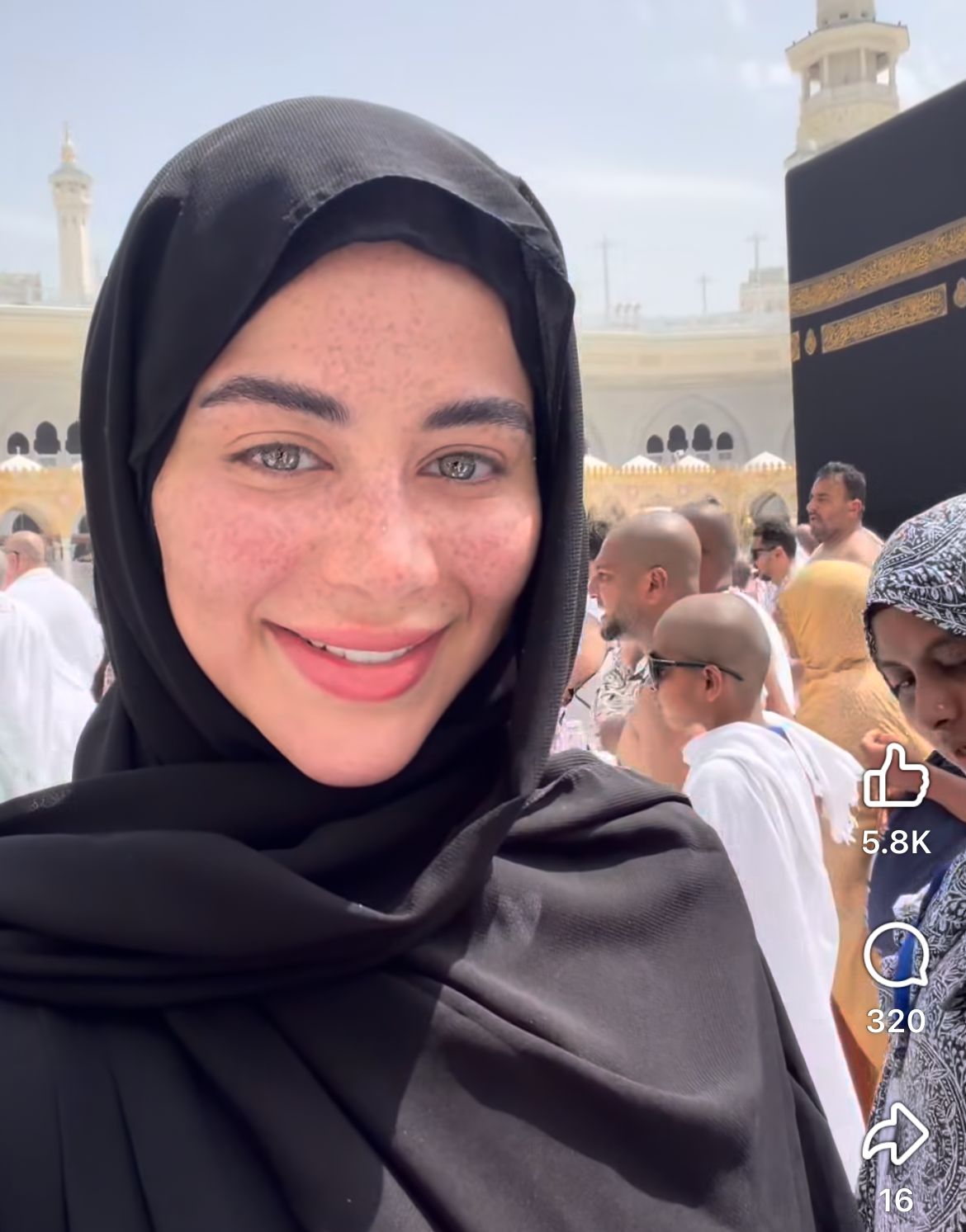 وظهرت يارا السكري بالحجاب وخطفت الأنظار بجمالها الطبيعي، اثناء أداء العمرة من أمام الكعبة.