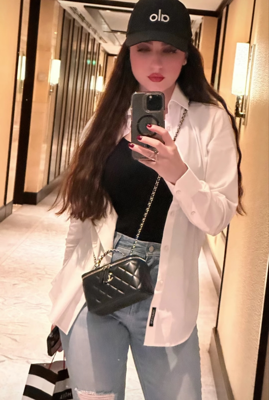 كما اختارت ياسمين عز، أن تترك شعرها البني الطويل منسدلا بين كتفيها بطريقة ناعمة مع وضع كاب باللون الاسود ليكشف عن جمالها.