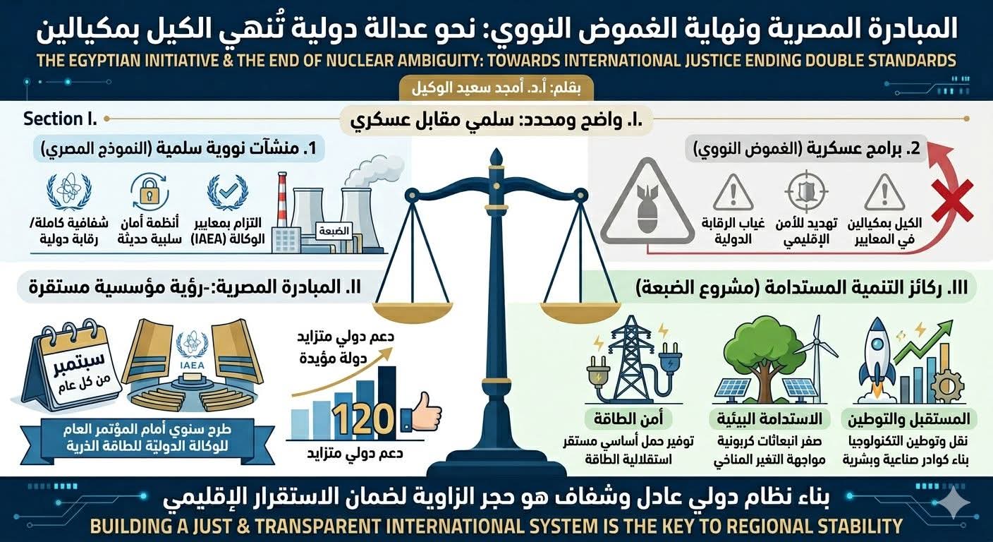 واختتم الوكيل بقوله إن القضية اليوم لم تعد فقط منع الانتشار النووي، بل تحقيق العدالة في تطبيقه. فلا يمكن بناء نظام دولي مستقر في ظل استمرار سياسات الغموض النووي والكيل بمكيالين، ان المبادرة المصرية تمثل دعوة واضحة لإرساء نظام دولي عادل وشفاف، تتحول فيه الطاقة النووية إلى أداة للتنمية لا وسيلة للتهديد، ويخضع فيه الجميع لنفس القواعد بلا استثناء.