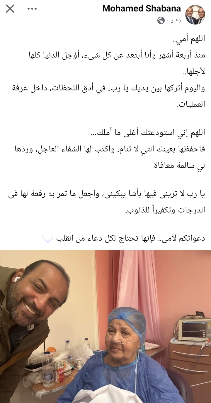 نشر الإعلامي وعضو مجلس الشيوخ محمد شبانة صورة له رفقة والدته كشف خلالها عن مرورها بأزمة صحية دقيقة، وخضوعها لعملية جراحية خلال الساعات الحالية.