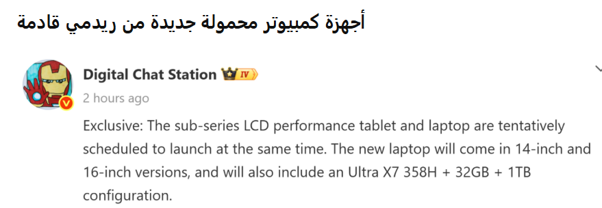 بحسب أحد المصادر، ستُزوَّد أجهزة الكمبيوتر المحمولة الجديدة من ريدمي بمعالج Intel Core Ultra X7 358H، مع ذاكرة وصول عشوائي (RAM) سعة 32 جيجابايت وسعة تخزين 1 تيرابايت. وستتوفر بخيارين لحجم الشاشة: 14 بوصة و16 بوصة.
