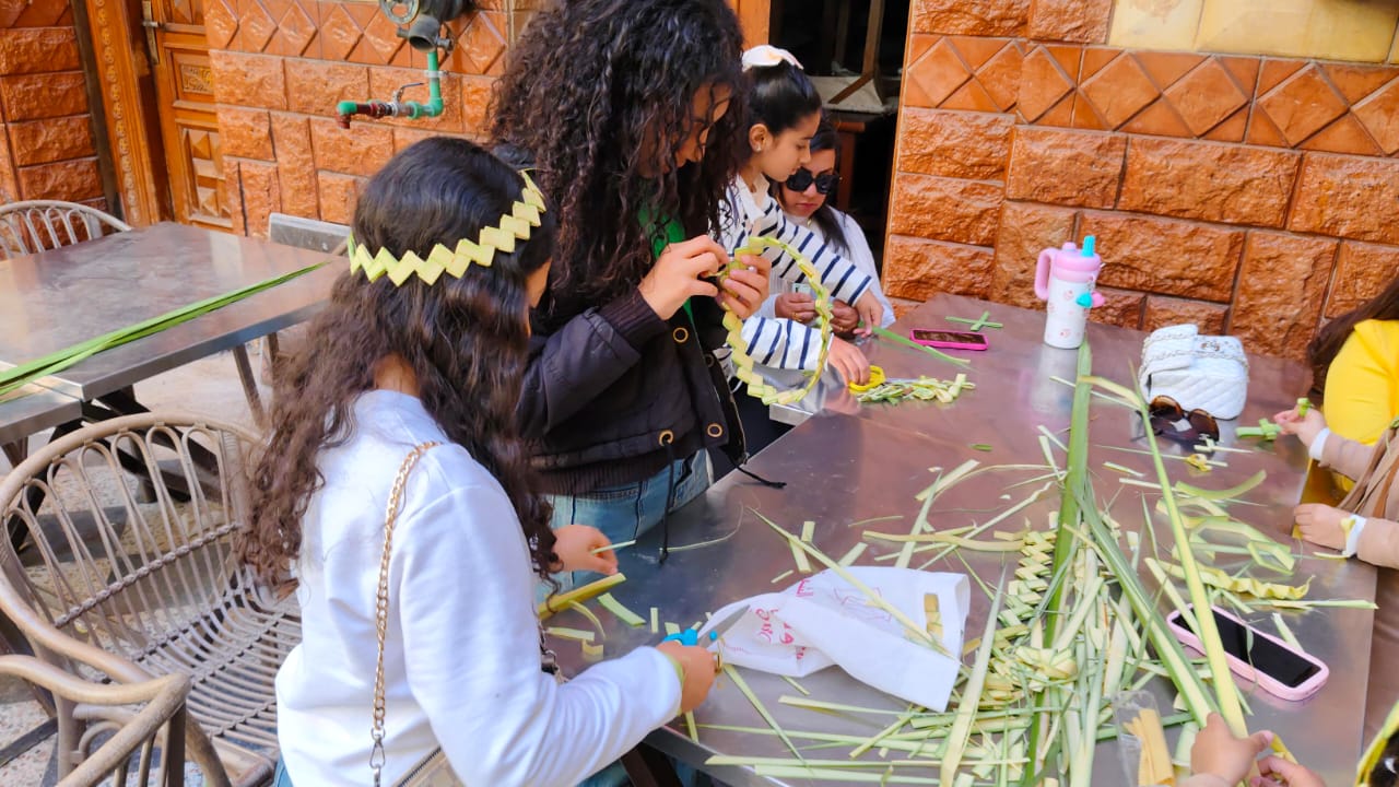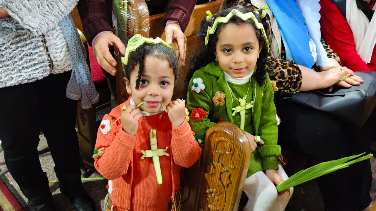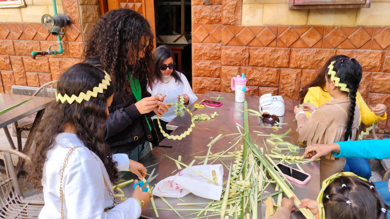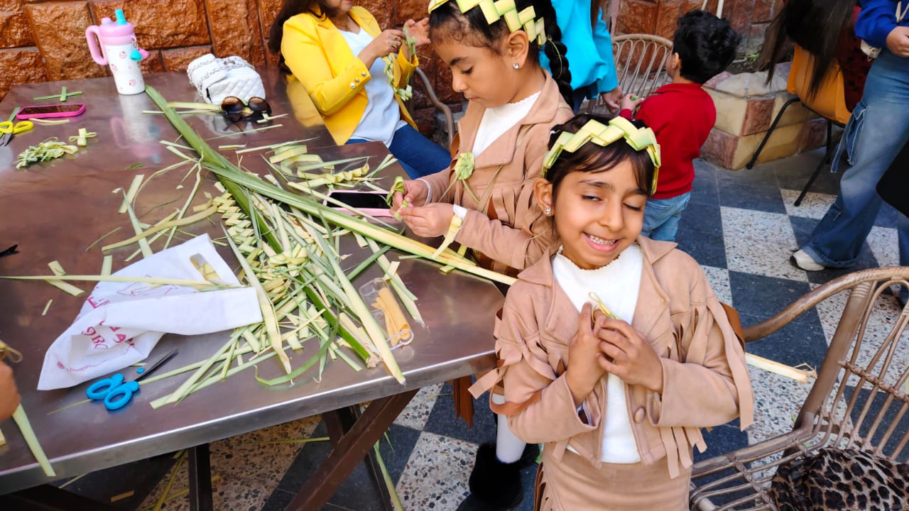 "تيجان وصلبان من السعف والزيّ الملوكي".. بهجة أحد الشعانين تزين كنيسة الأنبا بيشوي
