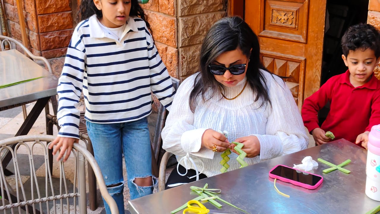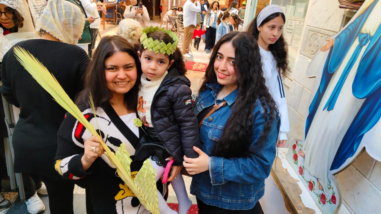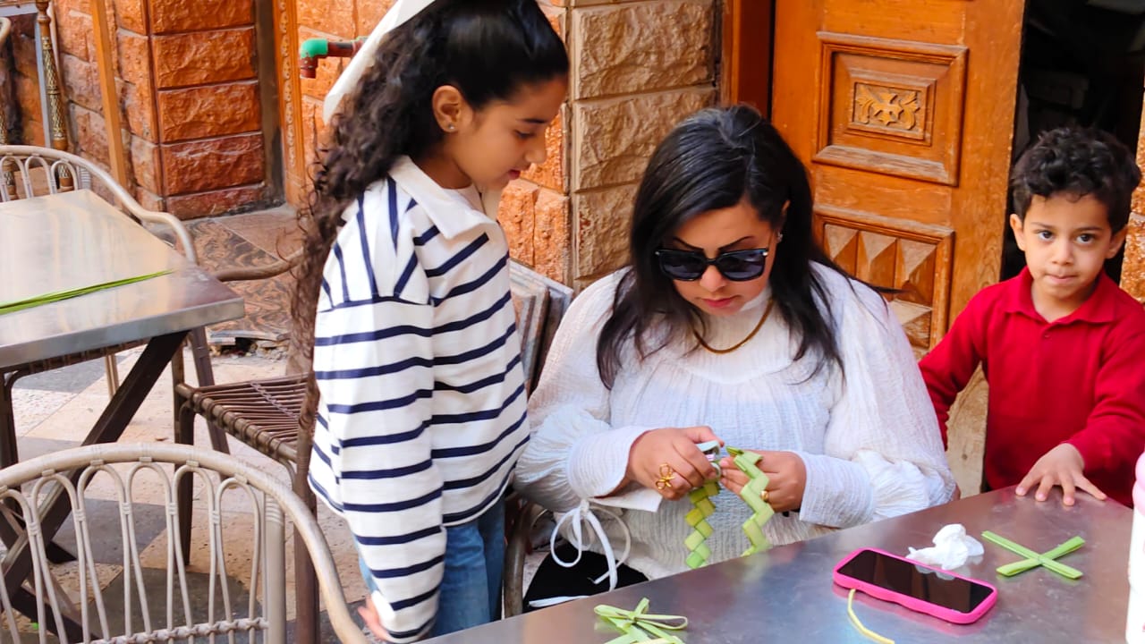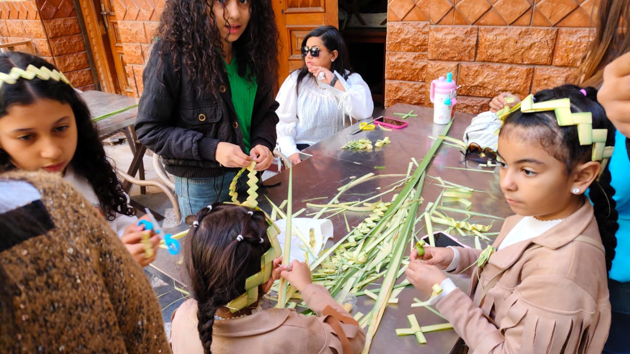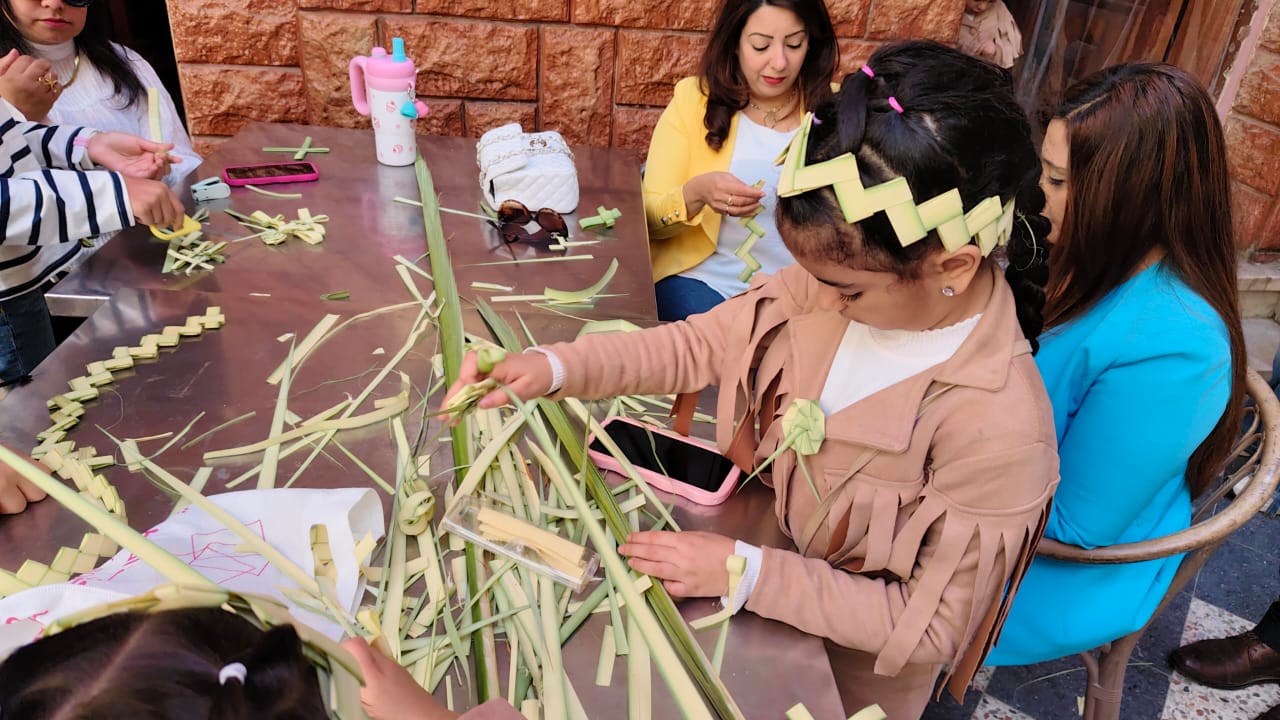 "تيجان وصلبان من السعف والزيّ الملوكي".. بهجة أحد الشعانين تزين كنيسة الأنبا بيشوي