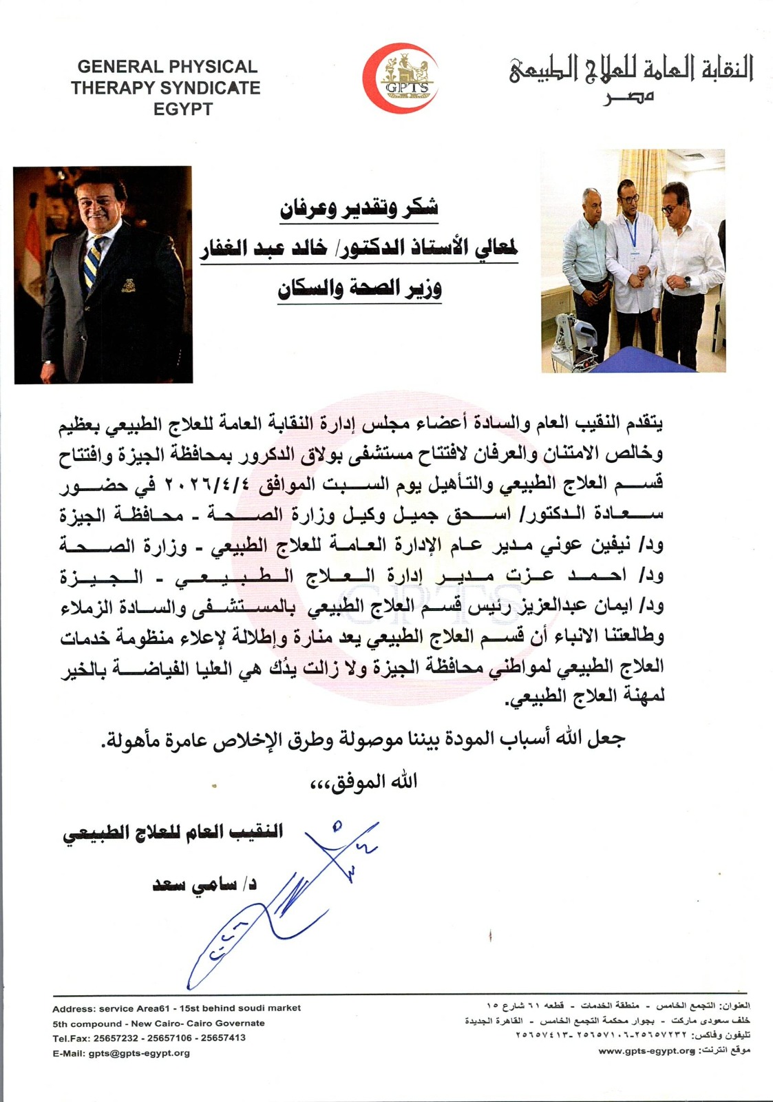 وجهت النقابة العامة للعلاج الطبيعي، برئاسة النقيب العام الدكتور سامي سعد، الشكر والتقدير والعرفان للدكتور خالد عبد الغفار، وزير الصحة والسكان، وذلك بمناسبة افتتاح مستشفى بولاق الدكرور العام بمحافظة الجيزة، وافتتاح قسم العلاج الطبيعي والتأهيل الجديد بها.