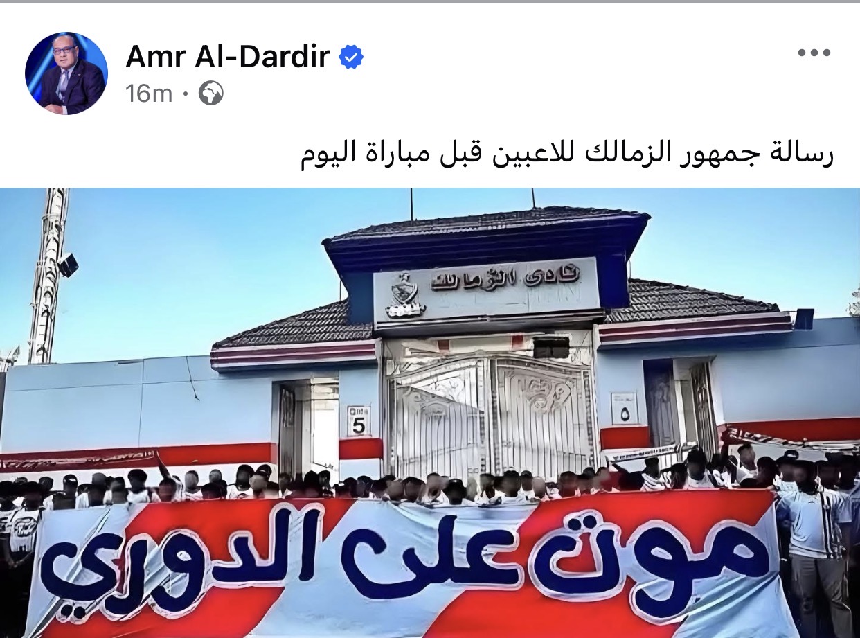 وكتب الدرديري عبر حسابه الشخصي بموقع فيسبوك: “رسالة جمهور الزمالك للاعبين قبل مباراة اليوم..موت على الدوري”.