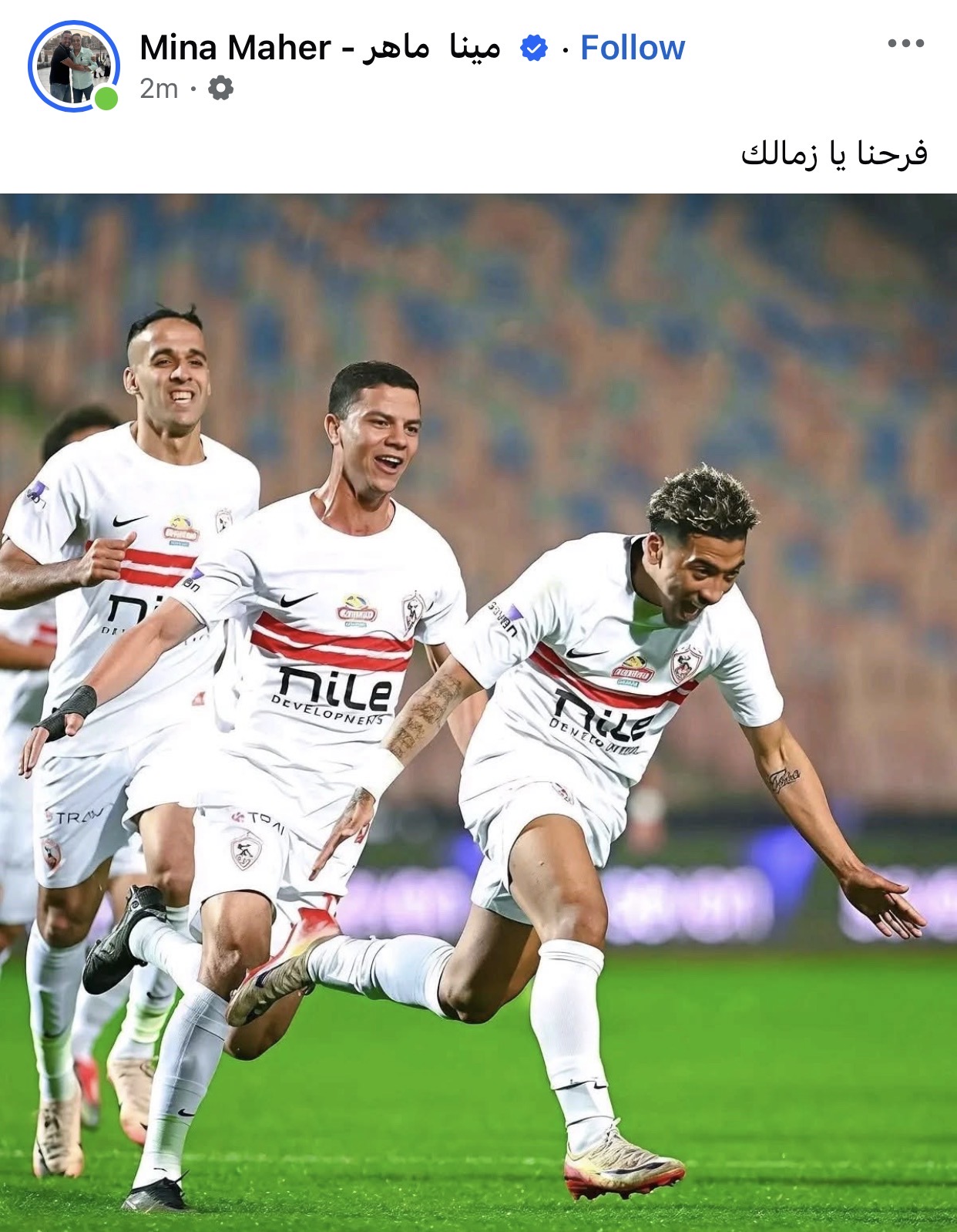وكتب مينا ماهر عبر حسابه الشخصي بموقع فيسبوك: “فرحنا يا زمالك”.