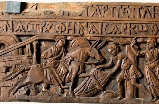 يعلو المشهد شريط من الكتابة اليونانية المحفورة ببراعة، وهي عبارة عن نص ديني (ترتيلة أو آية) تمجد الحدث، وتعتبر هذه الكتابة جزءاً لا يتجزأ من التصميم الجمالي والتوثيقي للقطعة.