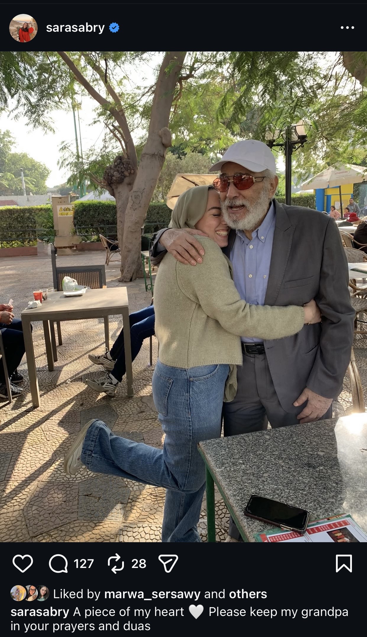 ونشرت سارة صورة تجمعها بجدها عبر حسابها على موقع التواصل الاجتماعي للصور والفيديوهات "إنستجرام"، وعلقت: "قطعة من قلبي.. أرجوكم ادعوا لجدي".