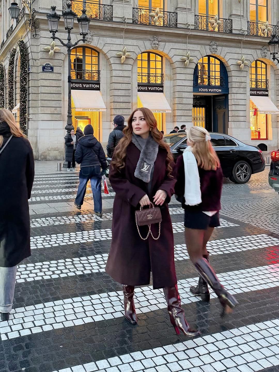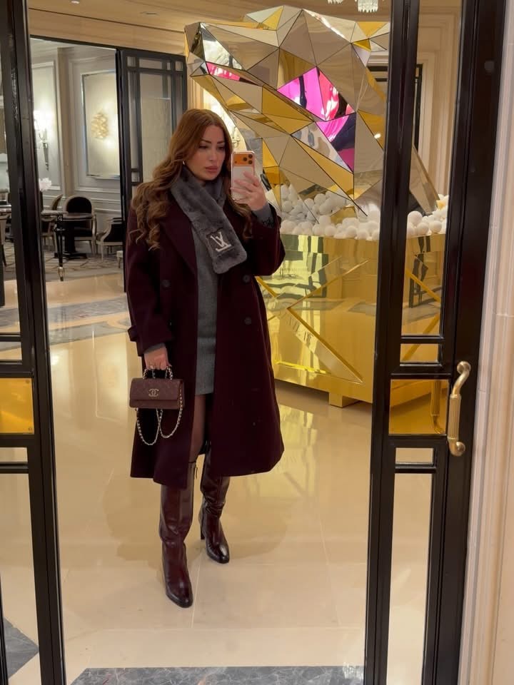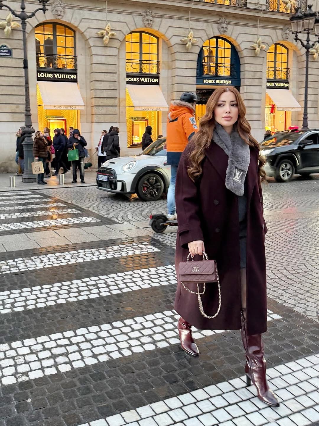 وظهرت نسرين في شوارع باريس بإطلالة كلاسيكية مميزة، حيث ارتدت معطفًا طويلًا باللون العنابي، نسقته مع بوت جلدي بنفس اللون وحقيبة أنيقة، ما أضفى على إطلالتها لمسة من الفخامة.