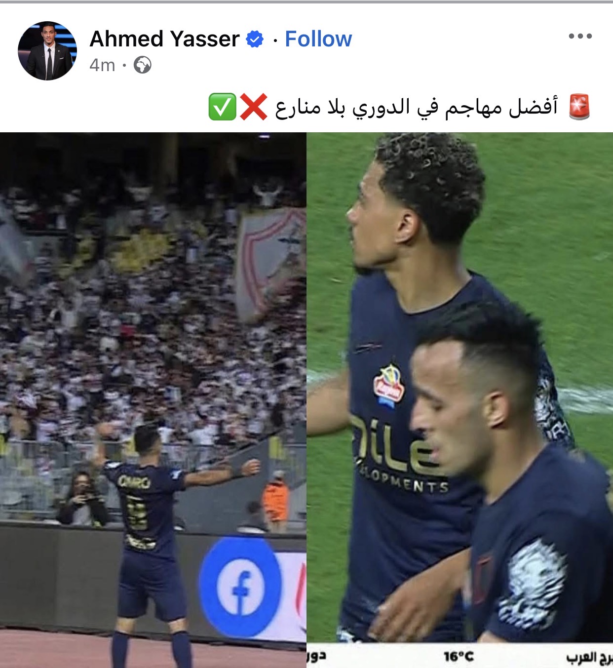 وكتب أحمد ياسر عبر حسابه الشخصي بموقع فيسبوك: “أفضل مهاجم في الدوري بلا منازع”.