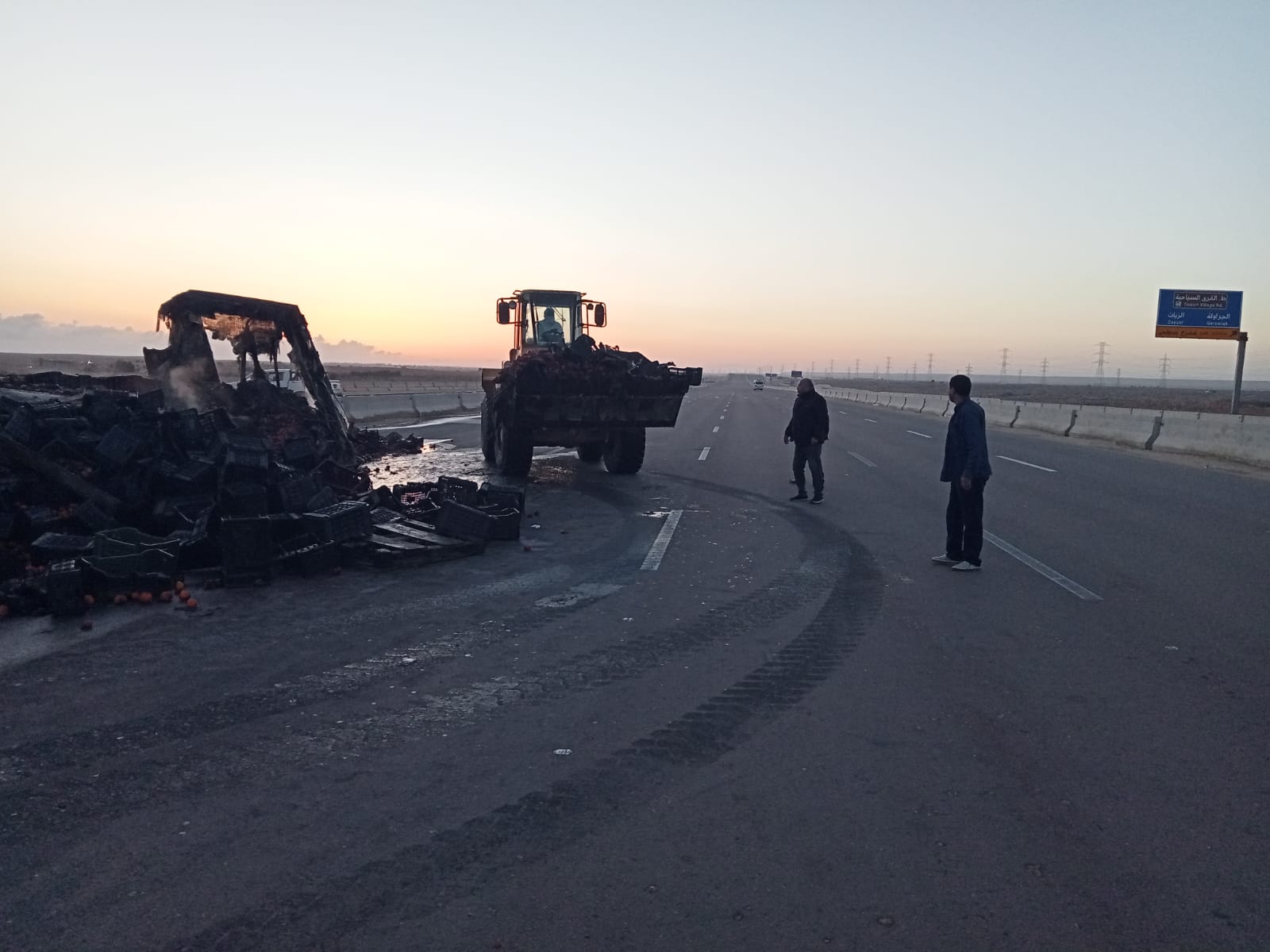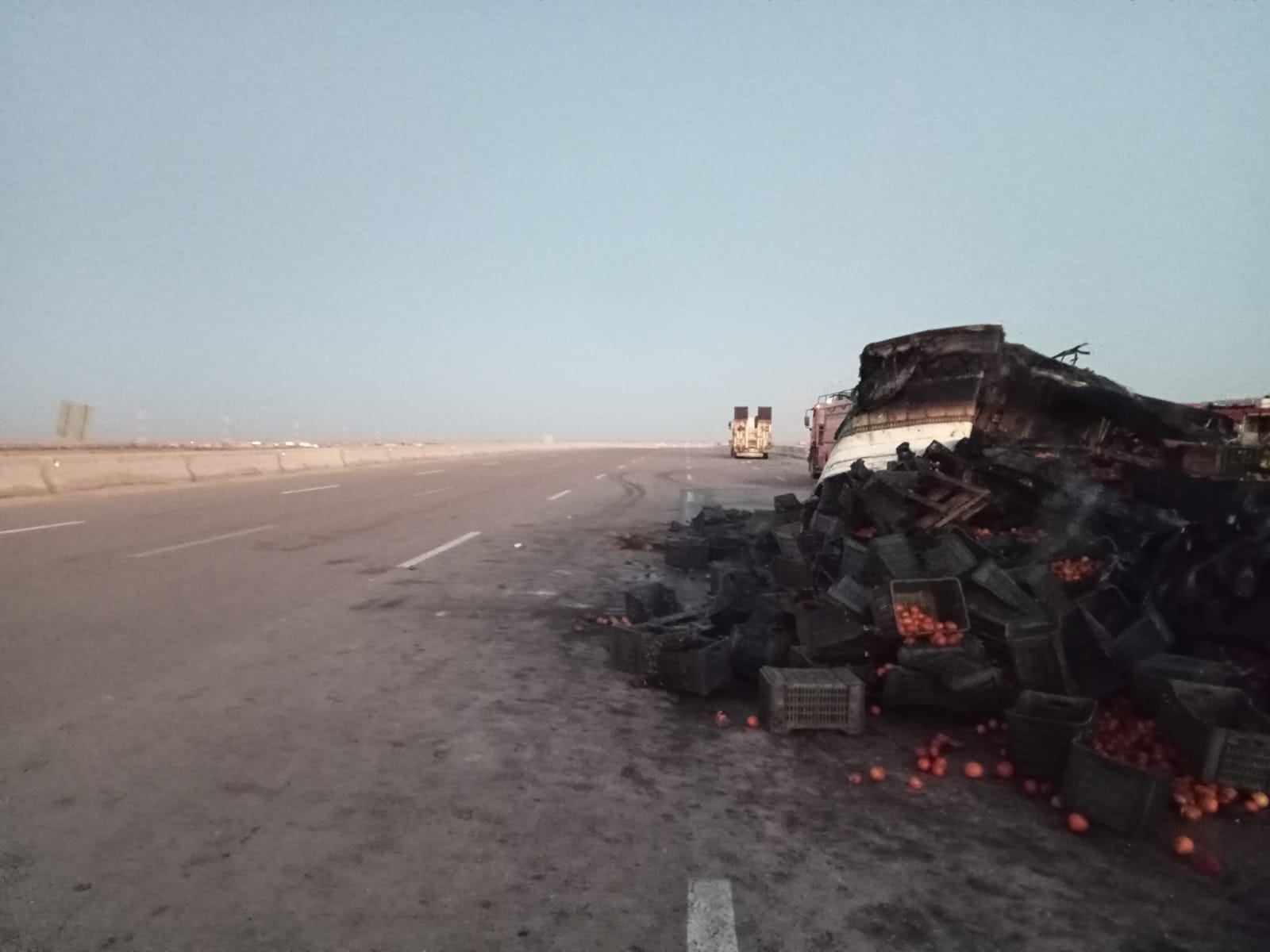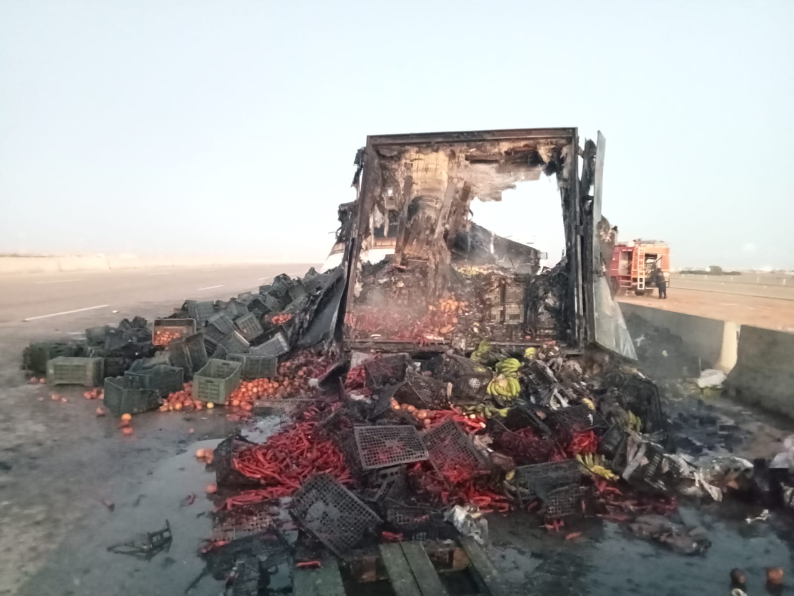 وتلقت غرفة العمليات وإدارة المرور بلاغًا باشتعال النار في سيارة في شاحنة بمبرد بها خضروات وفواكة ، وانتقل على الفور مجلس المدينة والحماية المدنية والمرور، وسيارات الإسعاف، والمعدات المخصّصة لرفع الحمولة الضخمة التي تسببت في إغلاق جزئي لأحد حارات الطريق الدولي .