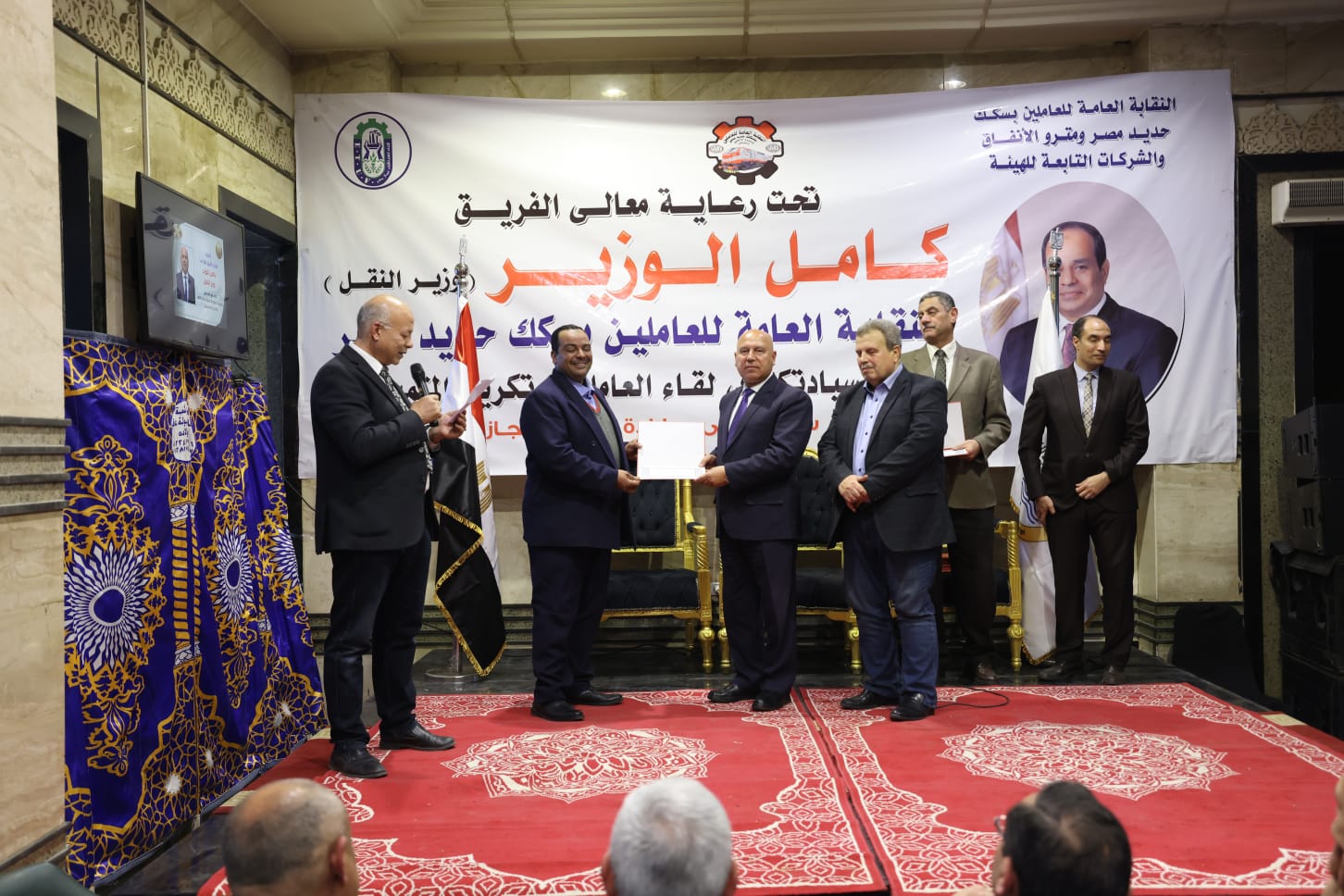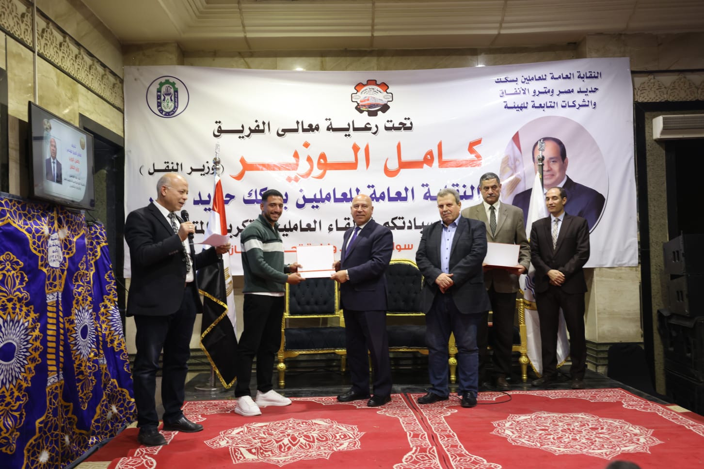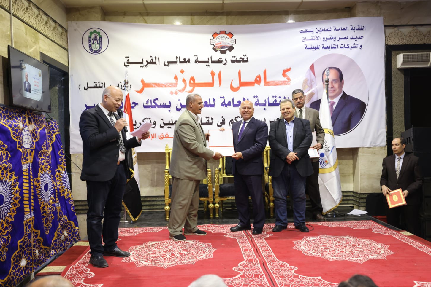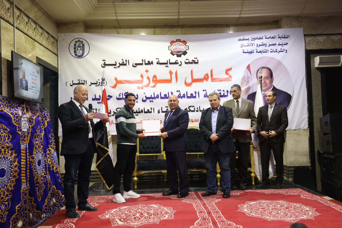 وفي ختام الاجتماع وفي إطار الاهتمام الكبير الذي توليه وزارة النقل بالعنصر البشري بالسكة الحديد باعتباره احد اهم عوامل نجاح المنظومة قام المهندس كامل الوزير بتكريم 22 من العاملين بالهيئة سواء من قائدي القطارات ، أو فنيي الحركة ،أو مشرفي القطارات أوخفراء المنافذ أو نظار المحطات والعاملين من طوائف التشغيل بمختلف القطاعات، وذلك تقديرًا لما اظهروه من احترافية وكفاءة عالية في منع وقوع حوادث ، و في رصد و احتواء المواقف الطارئة وسرعة التعامل معها والحد من تداعياتها المحتملة وفقا لإجراءات السلامة المعمول بها داخل الهيئة وبما يضمن الحفاظ على أرواح الركاب وتحقيق أعلى معدلات الامان و انتظام حركة التشغيل علي الشبكة.