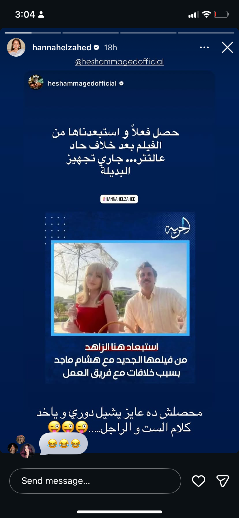 وبدأت الواقعة عندما نشر هشام ماجد عبر خاصية ستوري على حسابه الرسمي بموقع إنستجرام تعليقًا مازحًا، أشار فيه إلى استبعاد هنا الزاهد من فيلمه الجديد بسبب خلافات مع فريق العمل، قائلًا: حصل فعلا واستبعادها من الفيلم بعد خلاف حاد عالتتر وجاري تجهيز البديلة.