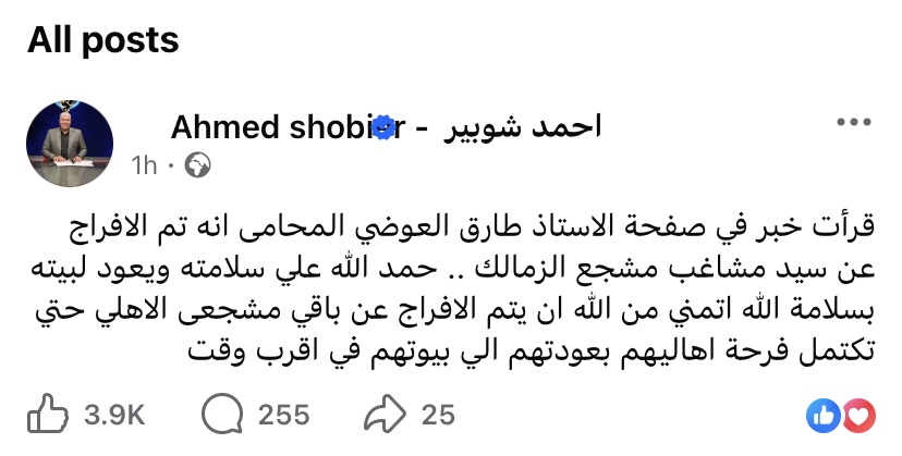 وكتب أحمد شوبير عبر صفحته الشخصية على فيسبوك: "قرأت خبر في صفحة الاستاذ طارق العوضي المحامى انه تم الافراج عن سيد مشاغب مشجع الزمالك".